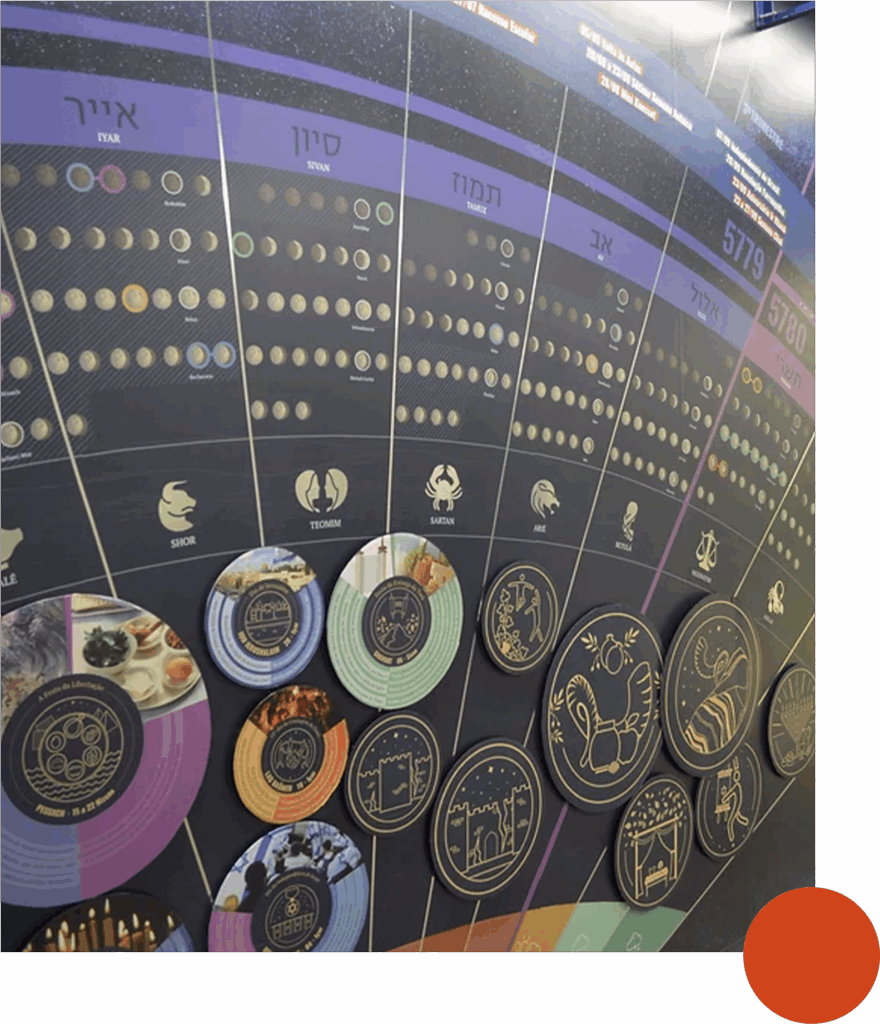 Criamos um grande calendário escolar apresentado a partir do calendário judaico, baseado nos ciclos da lua. Presente no saguão do colégio, funciona como uma agenda de atividades ao longo do ano e também como ferramenta pedagógica ao contar a história das principais datas judaicas.