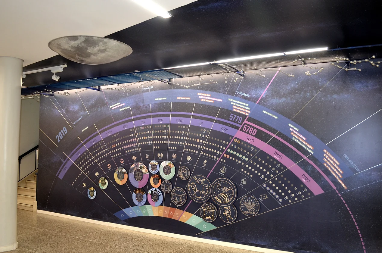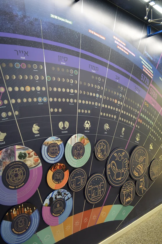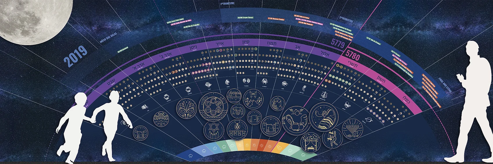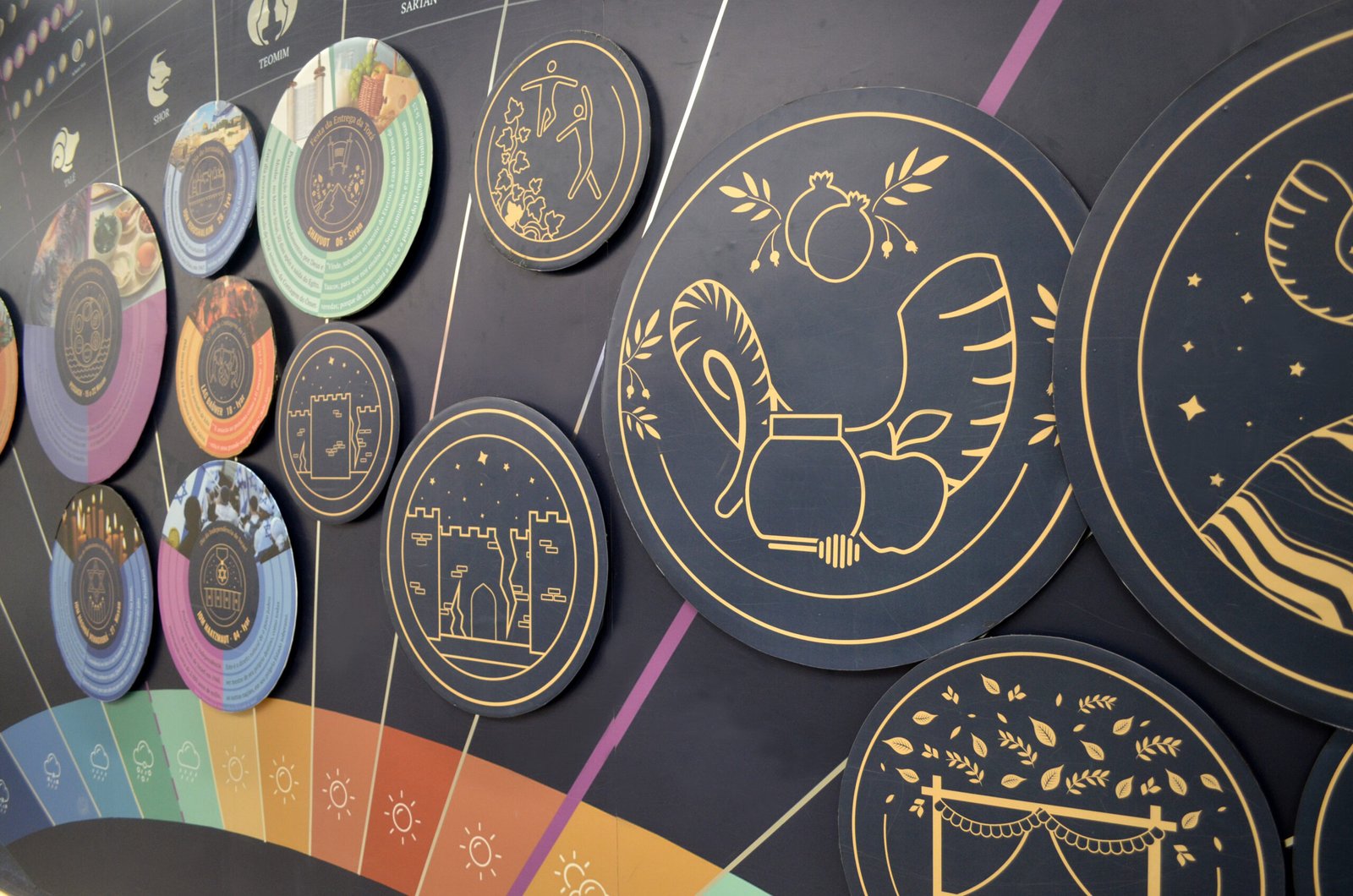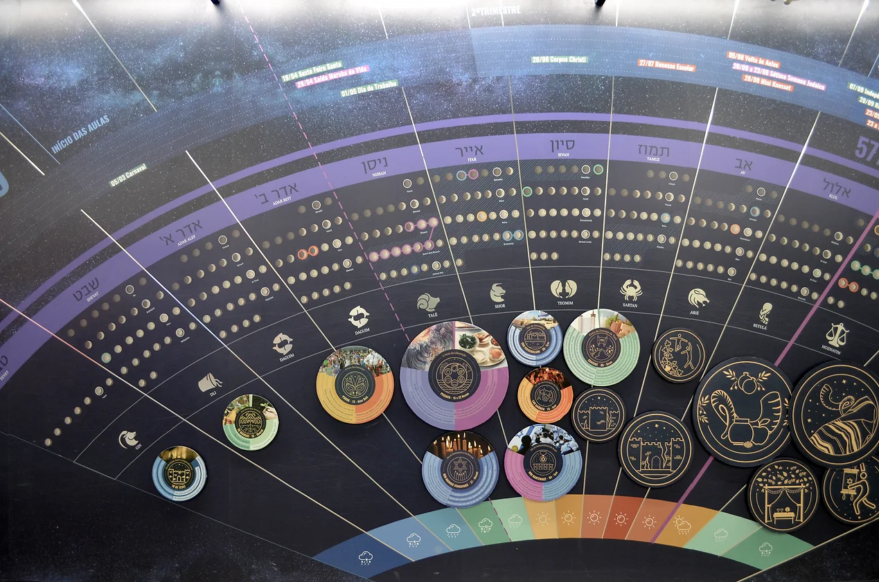 Criamos um grande calendário escolar apresentado a partir do calendário judaico, baseado nos ciclos da lua. Presente no saguão do colégio, funciona como uma agenda de atividades ao longo do ano e também como ferramenta pedagógica ao contar a história das principais datas judaicas.