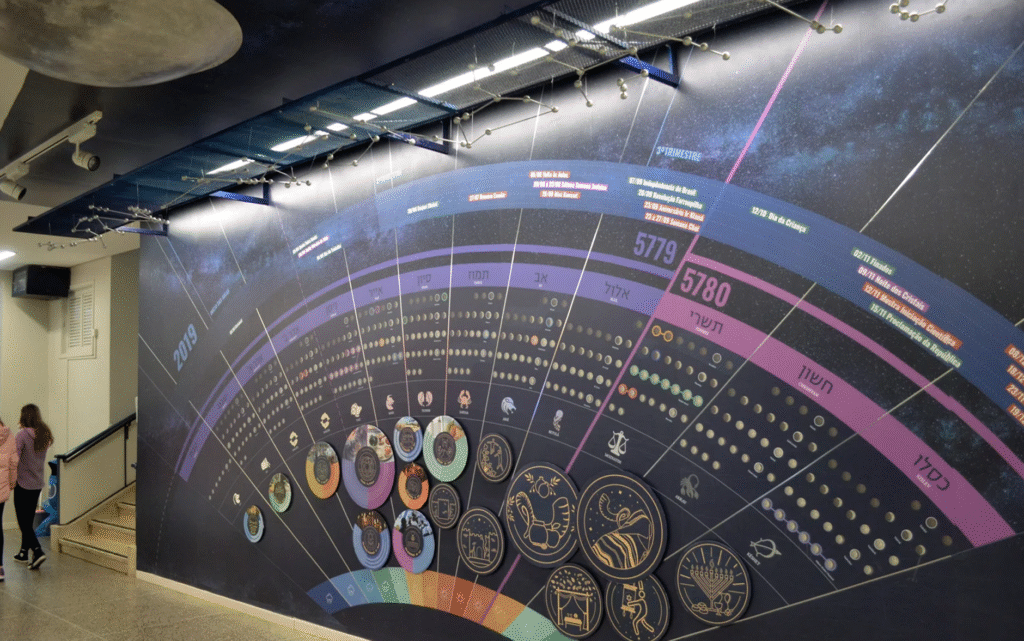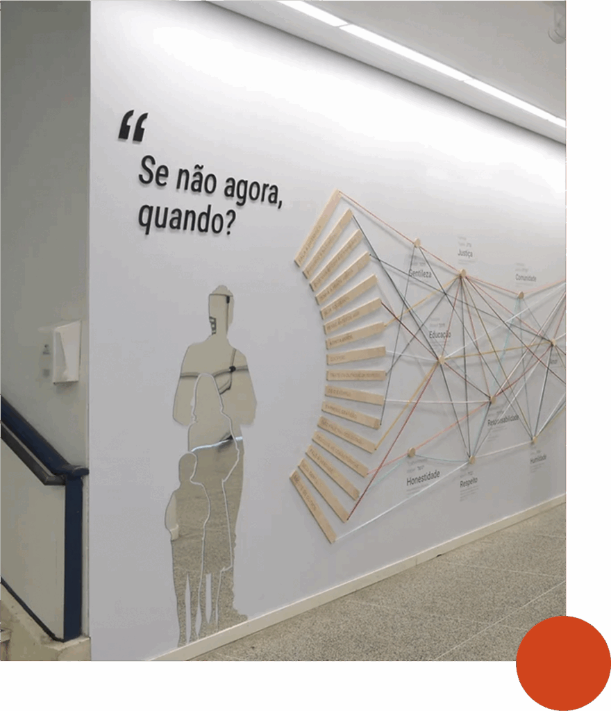 Criamos a exposição para o saguão do colégio com o conceito de refletir sobre a trajetória das ações cotidianas, orientadas pelos valores judaicos. A partir de elementos, textos e materialidades diferentes, propomos a interação dos estudantes com os painéis, reforçando a ideia da construção conjunta.