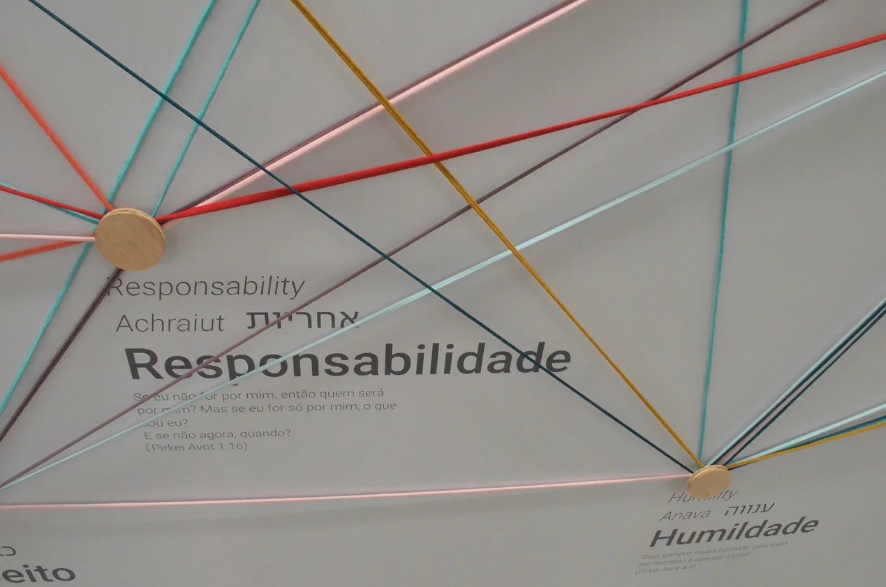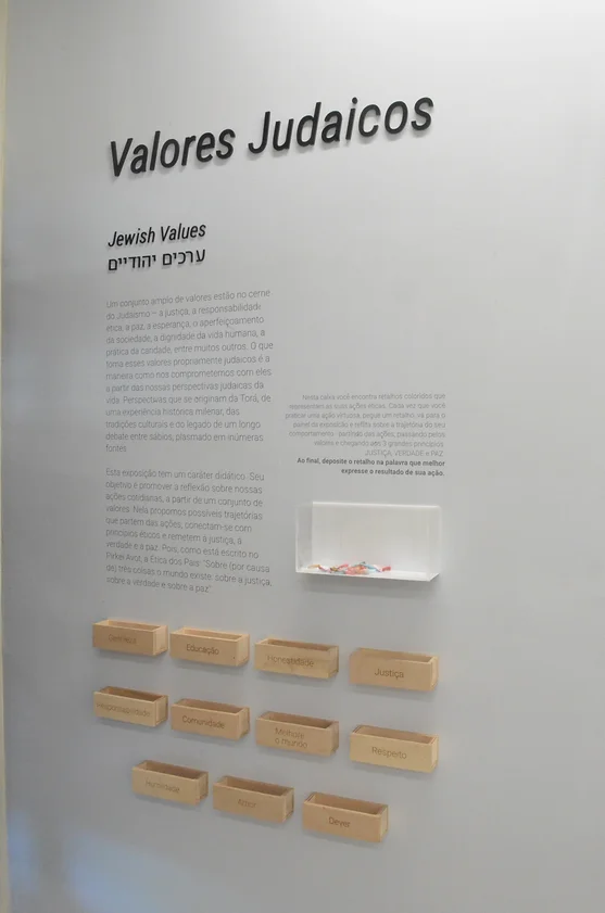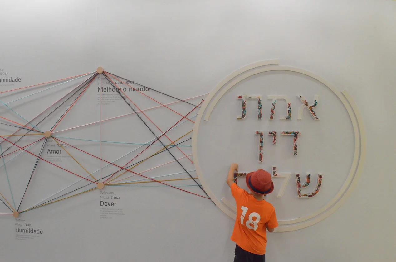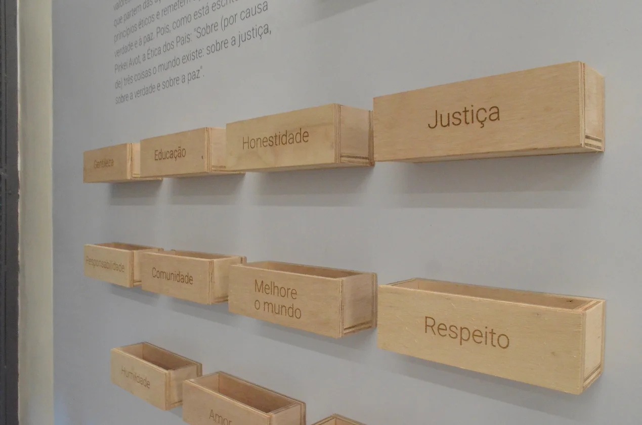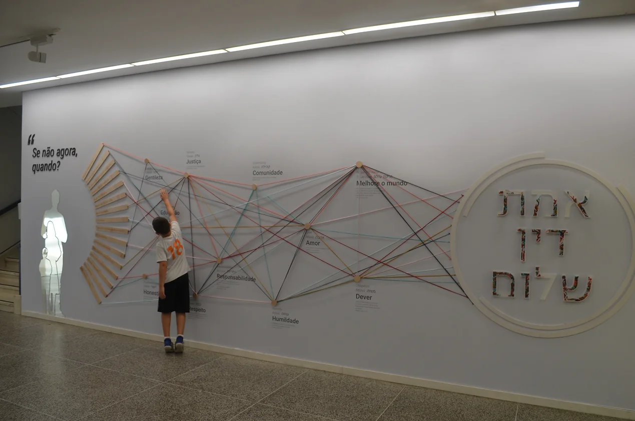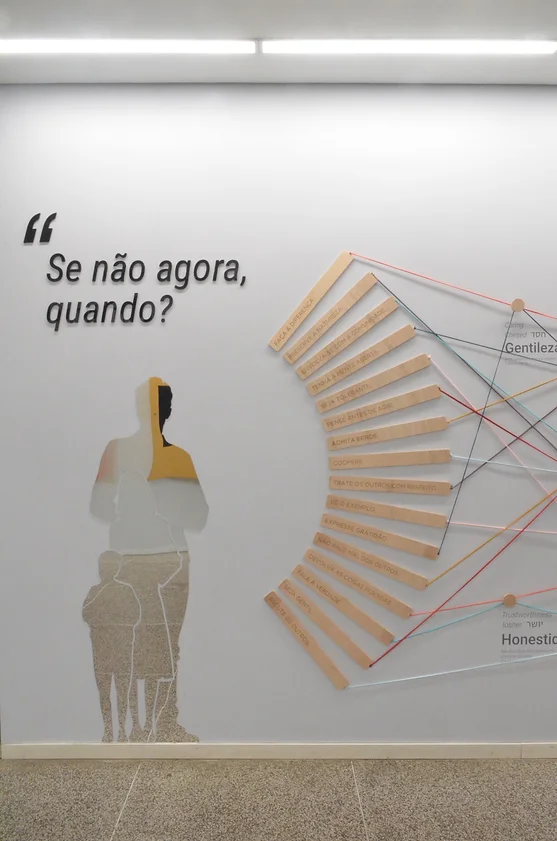 Criamos a exposição para o saguão do colégio com o conceito de refletir sobre a trajetória das ações cotidianas, orientadas pelos valores judaicos. A partir de elementos, textos e materialidades diferentes, propomos a interação dos estudantes com os painéis, reforçando a ideia da construção conjunta.