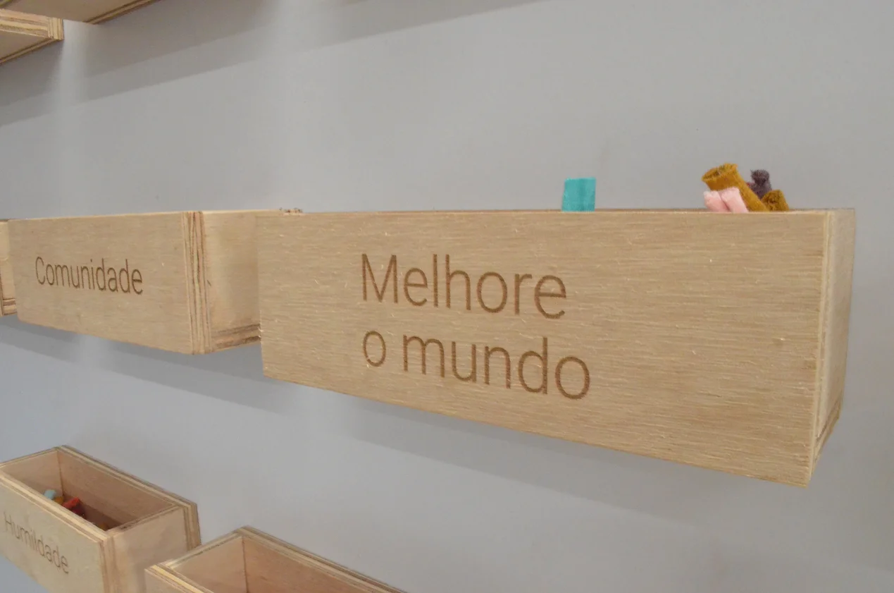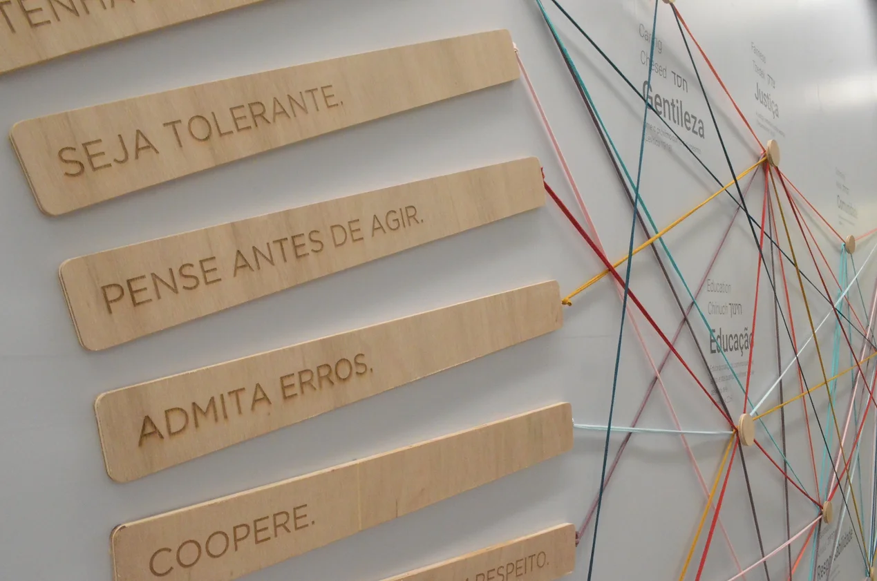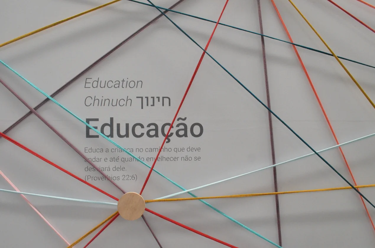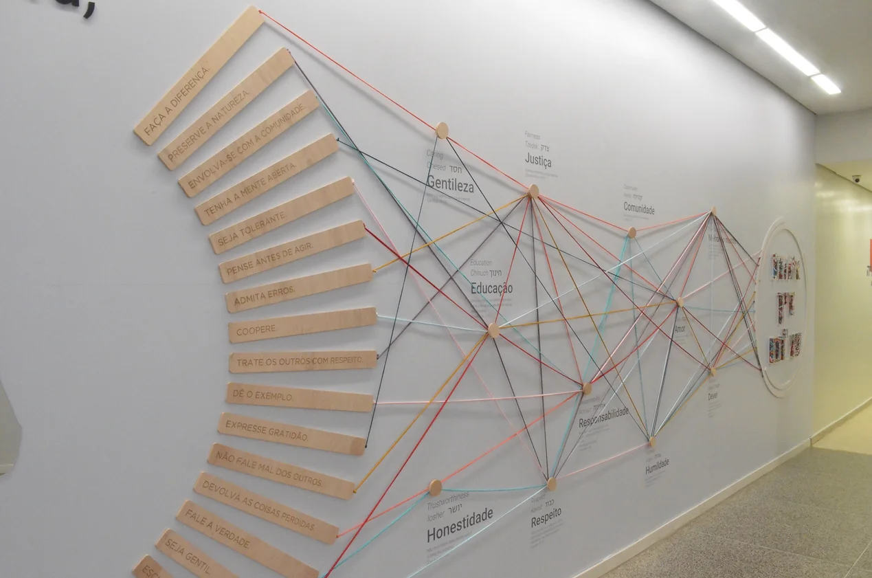 Criamos a exposição para o saguão do colégio com o conceito de refletir sobre a trajetória das ações cotidianas, orientadas pelos valores judaicos. A partir de elementos, textos e materialidades diferentes, propomos a interação dos estudantes com os painéis, reforçando a ideia da construção conjunta.