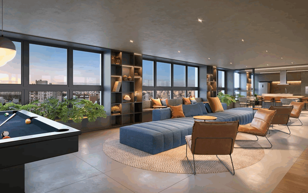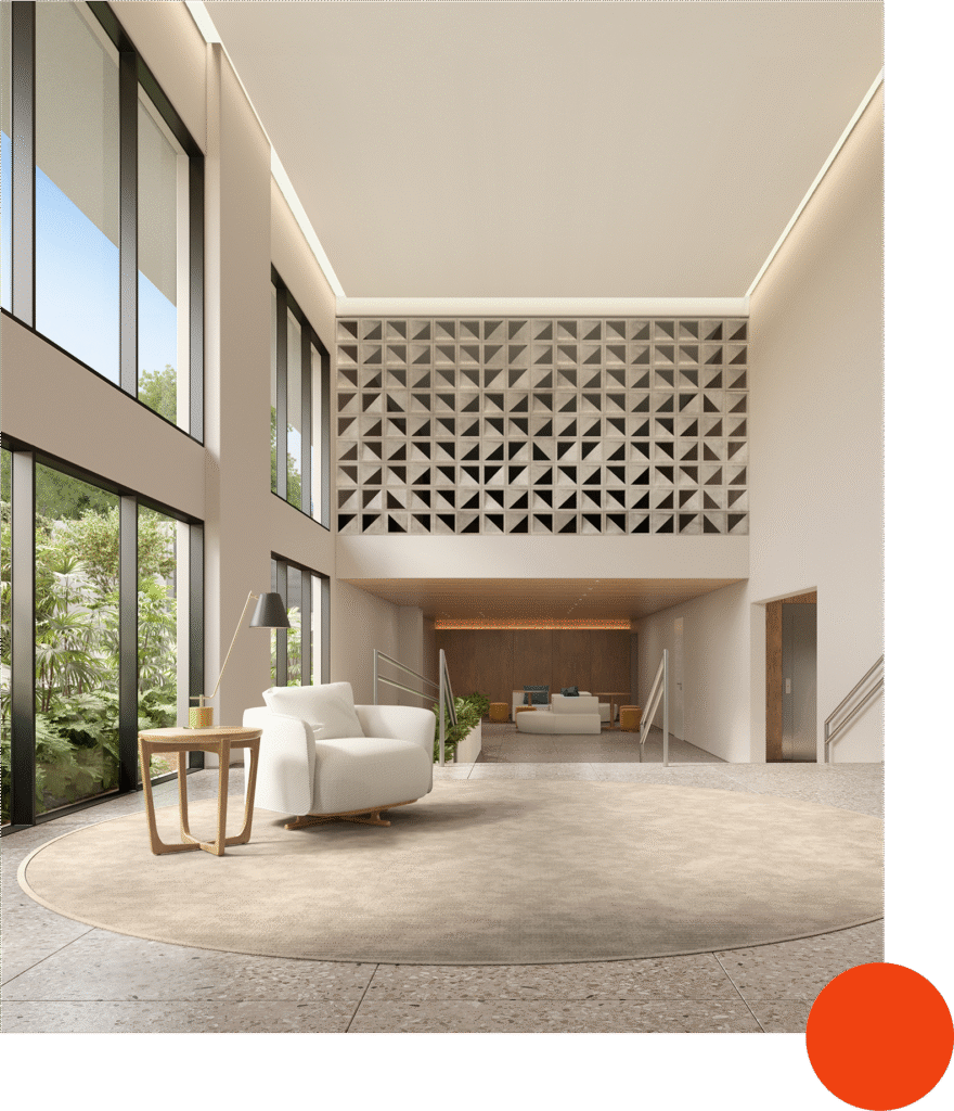 Nossa inspiração veio na história do bairro onde o empreendimento está localizado. A arquitetura modernista do Bom Fim nos guiou a reinventar elementos locais na decoração, criando ambientes aconchegantes, atemporais e integrados. Buscamos trazer o entorno para dentro, mesclando o tradicional com o novo. Na sinalética, o cobogó triangular foi nossa referência, explorando formas, sombras e o contraste entre cheios e vazios.