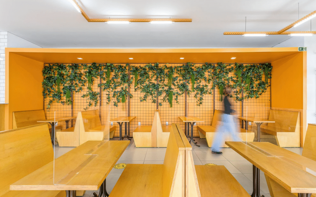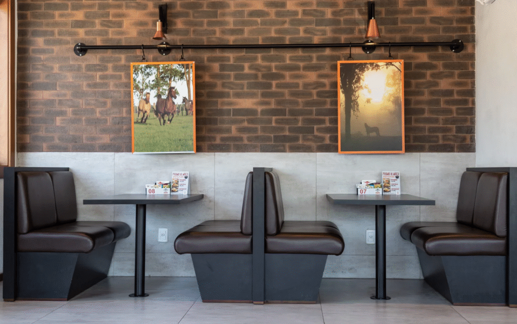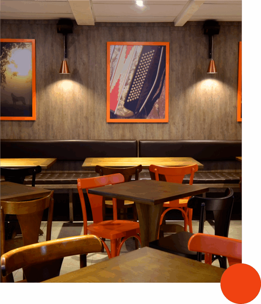Para o projeto da hamburgueria Pampa Burger, buscamos traduzir a identidade do gaúcho, combinando tradição e inovação em um espaço acolhedor e autêntico. A proposta parte do resgate de materiais tradicionais, como o tijolo, a madeira e o concreto. As cores e grafismos da marca guiam a paleta do interior, reforçando a identidade do produto e a experiência do cliente. Um lugar que convida à permanência, com atmosfera familiar, mas com um frescor de novidade.