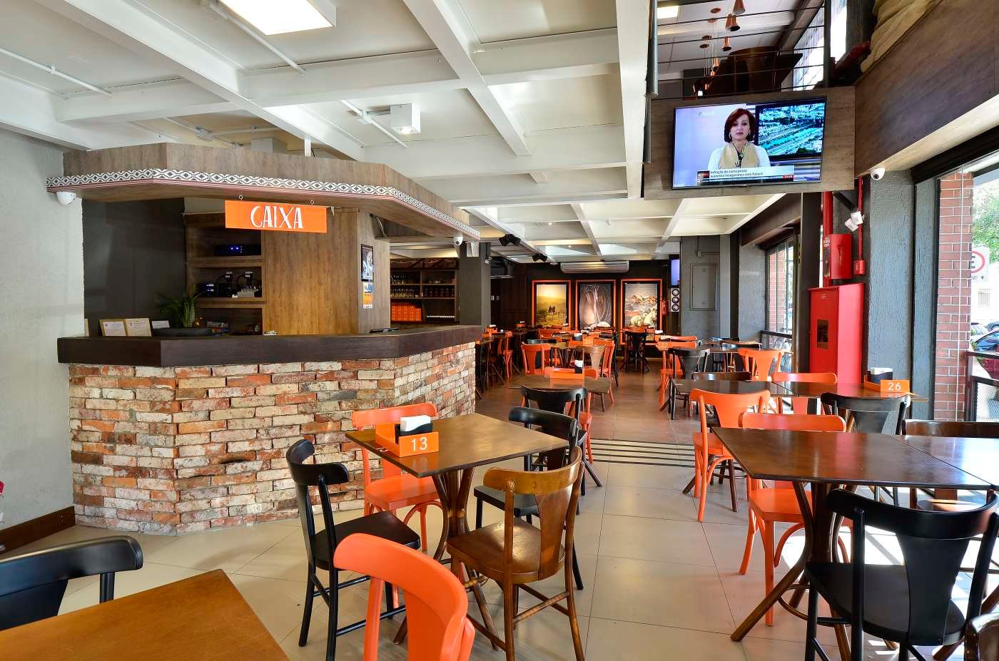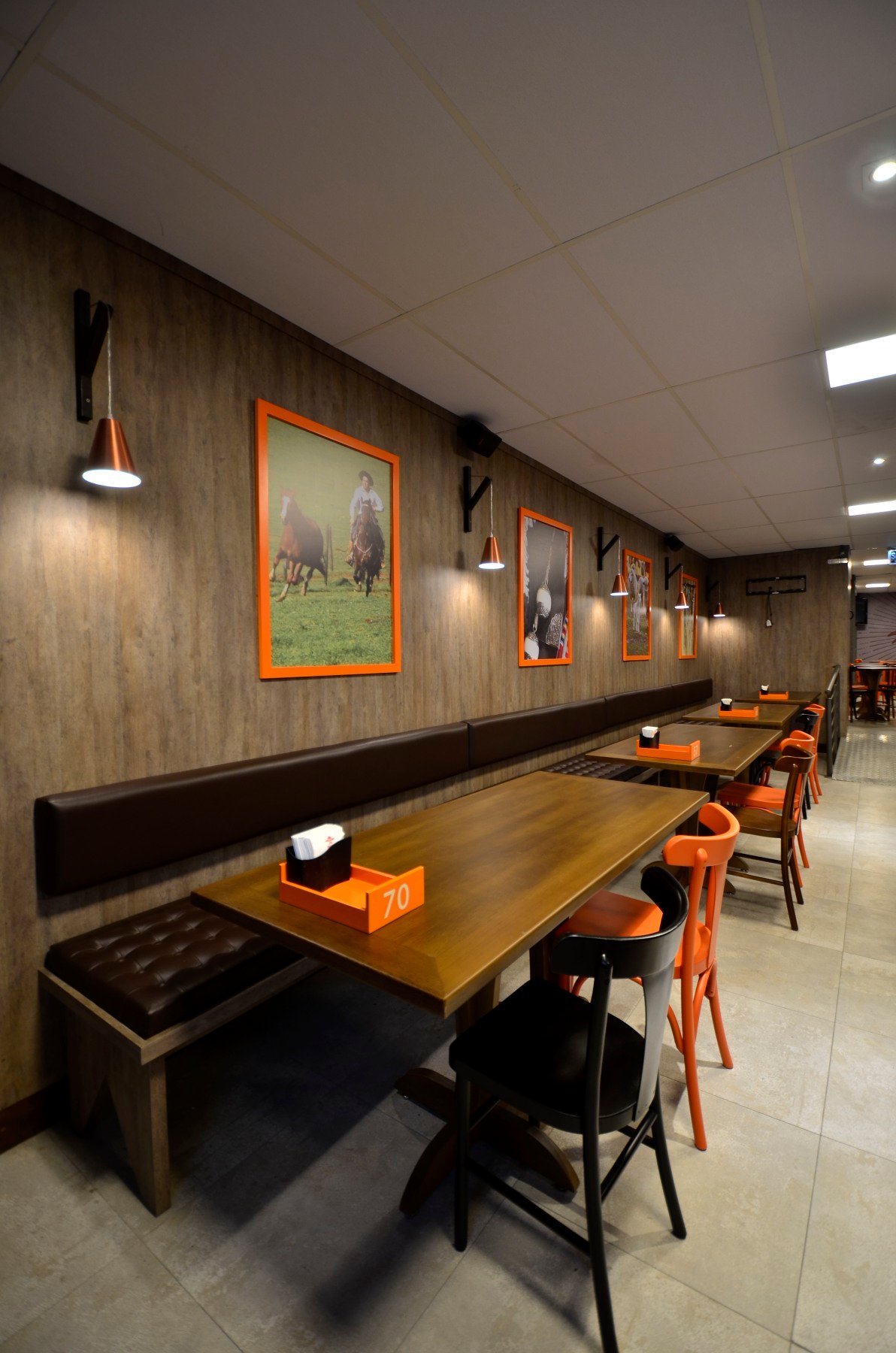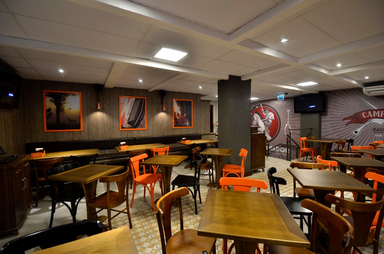 Para o projeto da hamburgueria Pampa Burger, buscamos traduzir a identidade do gaúcho, combinando tradição e inovação em um espaço acolhedor e autêntico. A proposta parte do resgate de materiais tradicionais, como o tijolo, a madeira e o concreto. As cores e grafismos da marca guiam a paleta do interior, reforçando a identidade do produto e a experiência do cliente. Um lugar que convida à permanência, com atmosfera familiar, mas com um frescor de novidade.