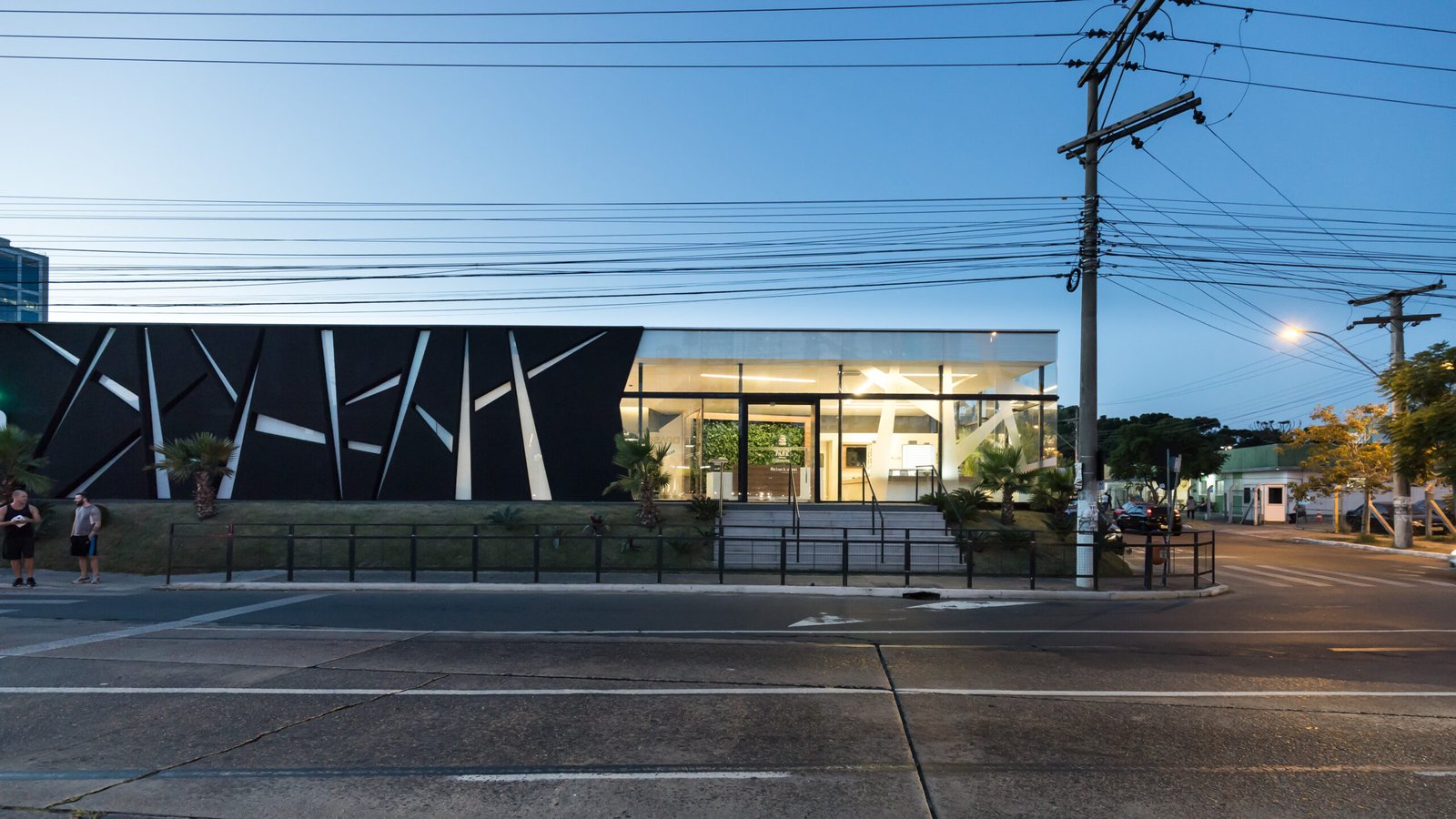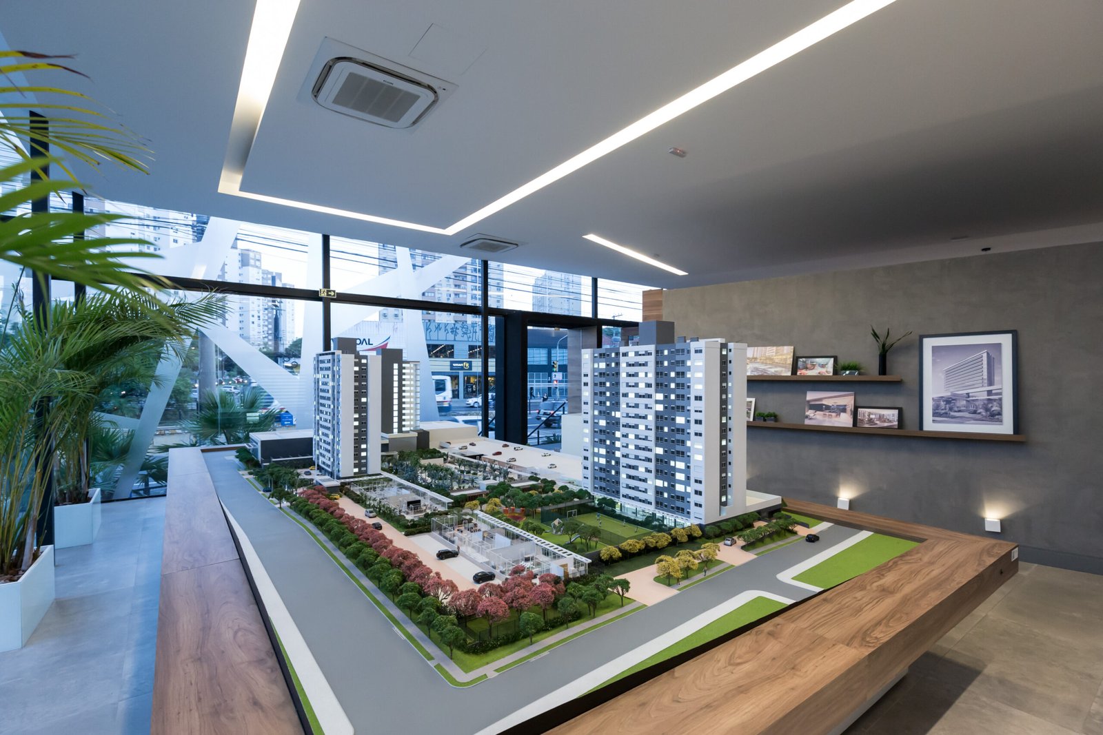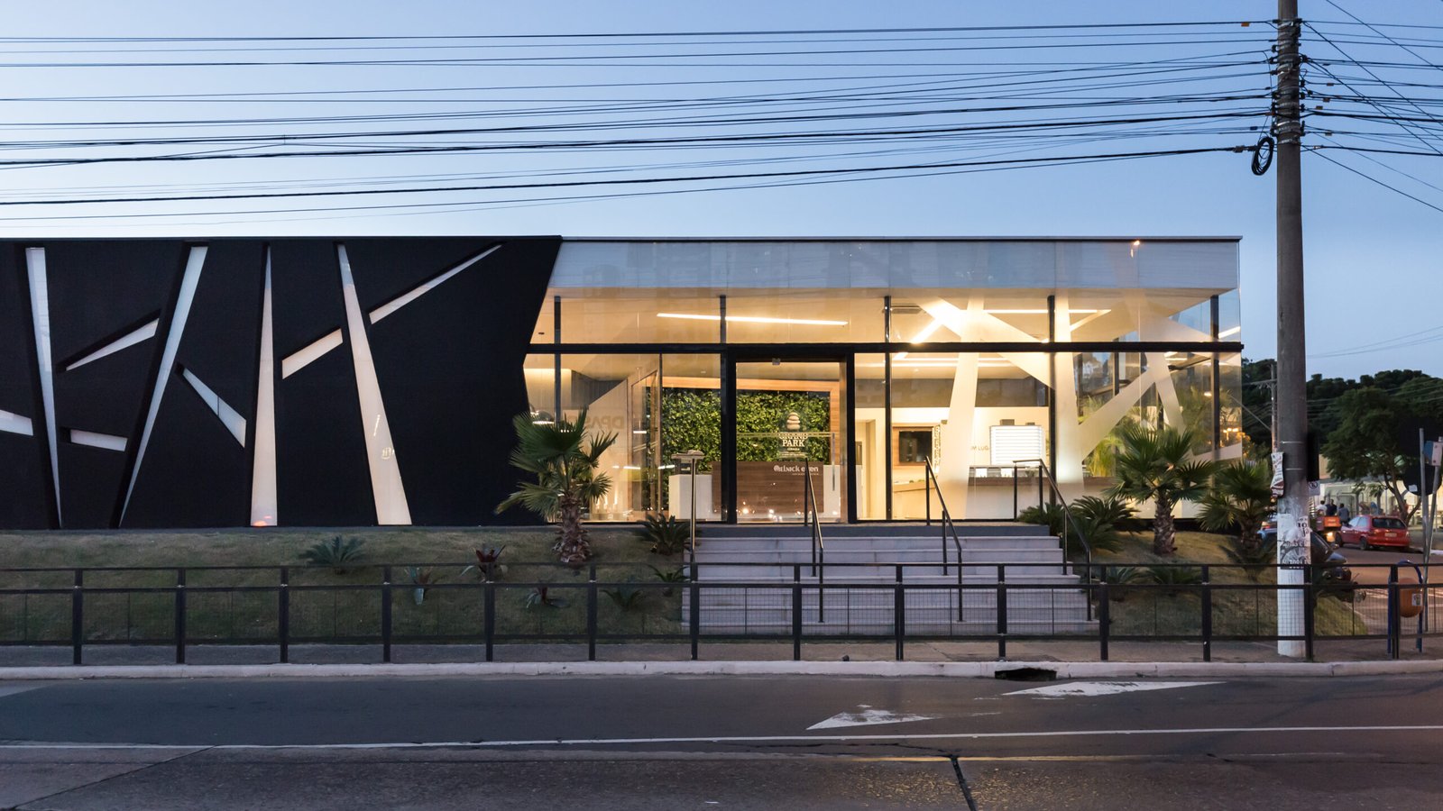 O Stand de Vendas Grandpark foi projetado para traduzir os principais valores do empreendimento: conexão com a natureza, bem-estar e qualidade de vida. A fachada traz rasgos de vidro e elementos visuais inspirados no entrelaçamento dos troncos de árvores, criando uma identidade que dialoga com o verde e o projeto do complexo.