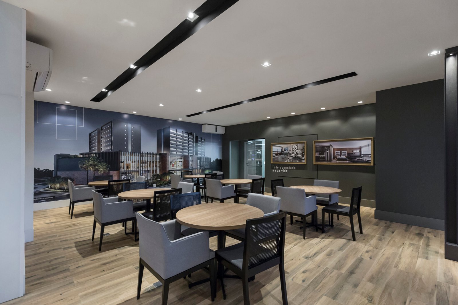 No interior, a vegetação está presente ao longo de todo o percurso, reforçando a ideia de convivência com a natureza. O espaço foi estruturado com um roteiro que conduz o visitante por experiências sensoriais, comunicação visual e uma sala imersiva que reforçam o estilo de vida das pessoas. O resultado é um ambiente que convida o público a imaginar e desejar seu futuro nesse novo modo de viver.
