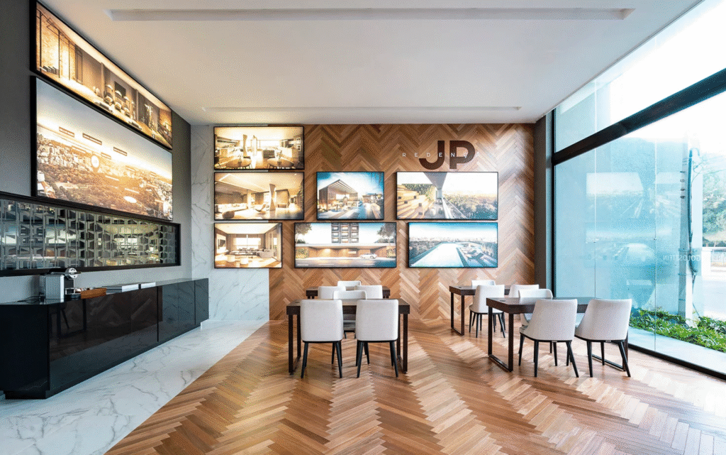 O projeto é marcado por linhas retas e um volume puro, com um plano envidraçado que convida a entrar e integra interior e exterior. Materiais com textura em mármore, madeira e espelho definem a identidade do espaço. Cores claras ampliam a luz natural e organizam uma atmosfera funcional. O lounge articula os ambientes com conforto e fluidez dentro de uma linguagem arquitetônica contemporânea.