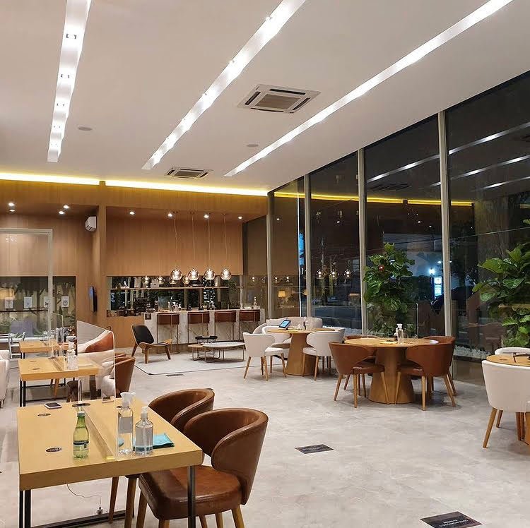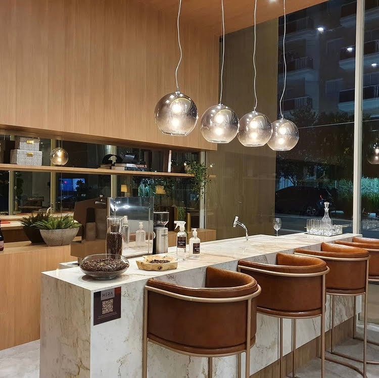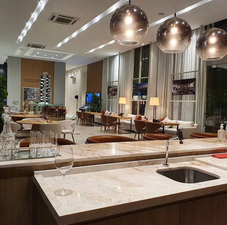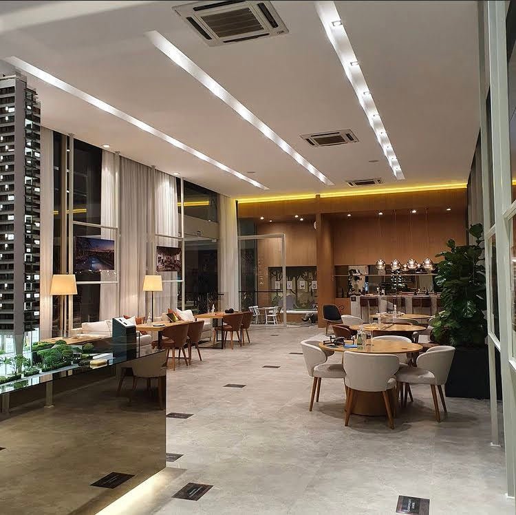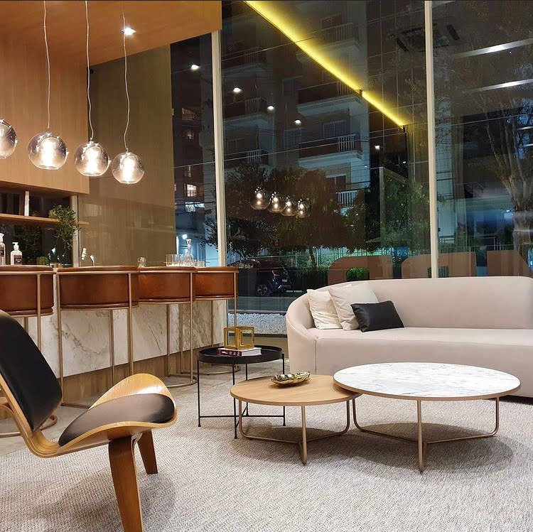 O projeto é marcado por linhas retas e um volume puro, com um plano envidraçado que convida a entrar e integra interior e exterior. Materiais com textura em mármore, madeira e espelho definem a identidade do espaço. Cores claras ampliam a luz natural e organizam uma atmosfera funcional. O lounge articula os ambientes com conforto e fluidez dentro de uma linguagem arquitetônica contemporânea.