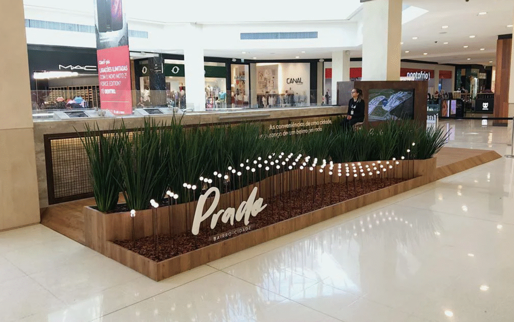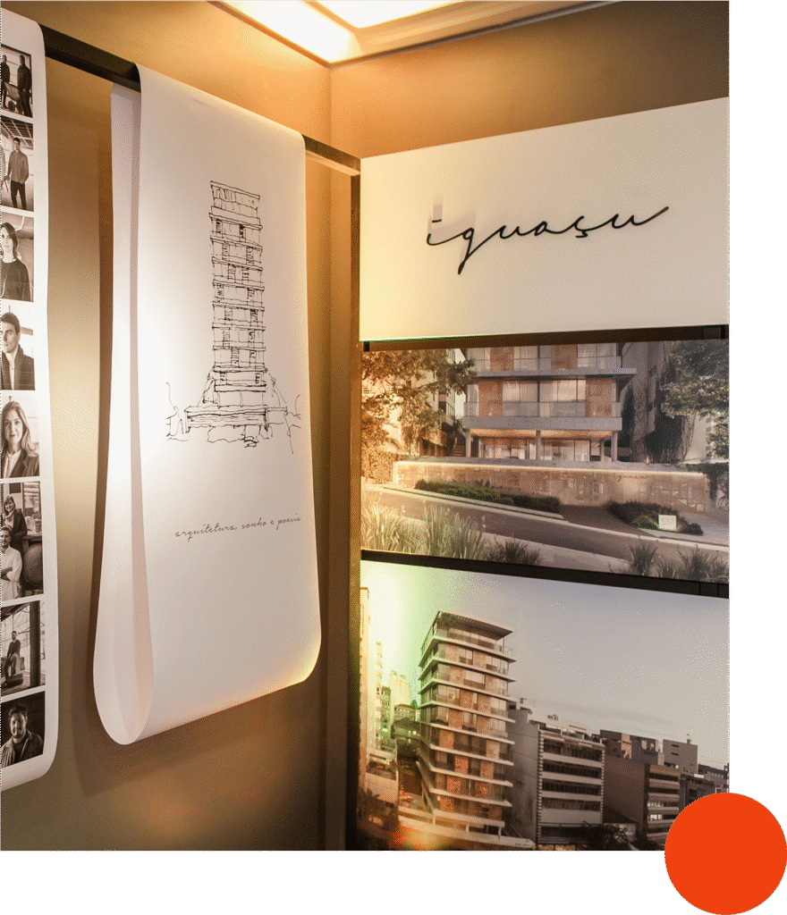 Um ambiente dedicado ao empreendimento Iguaçu dentro do ponto de venda da Saccaro. Com o objetivo de apresentar o conceito do Iguaçu, esse espaço expositivo explora o processo criativo autoral por trás de todo o projeto, também tangibilizado a partir dos lounges Saccaro, especialmente criados para o empreendimento.