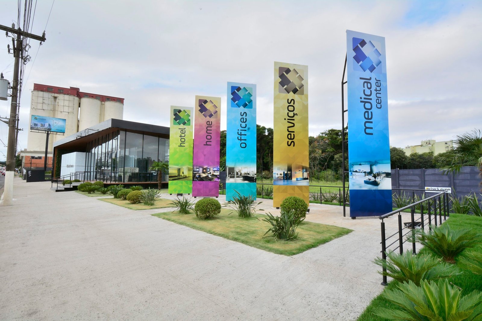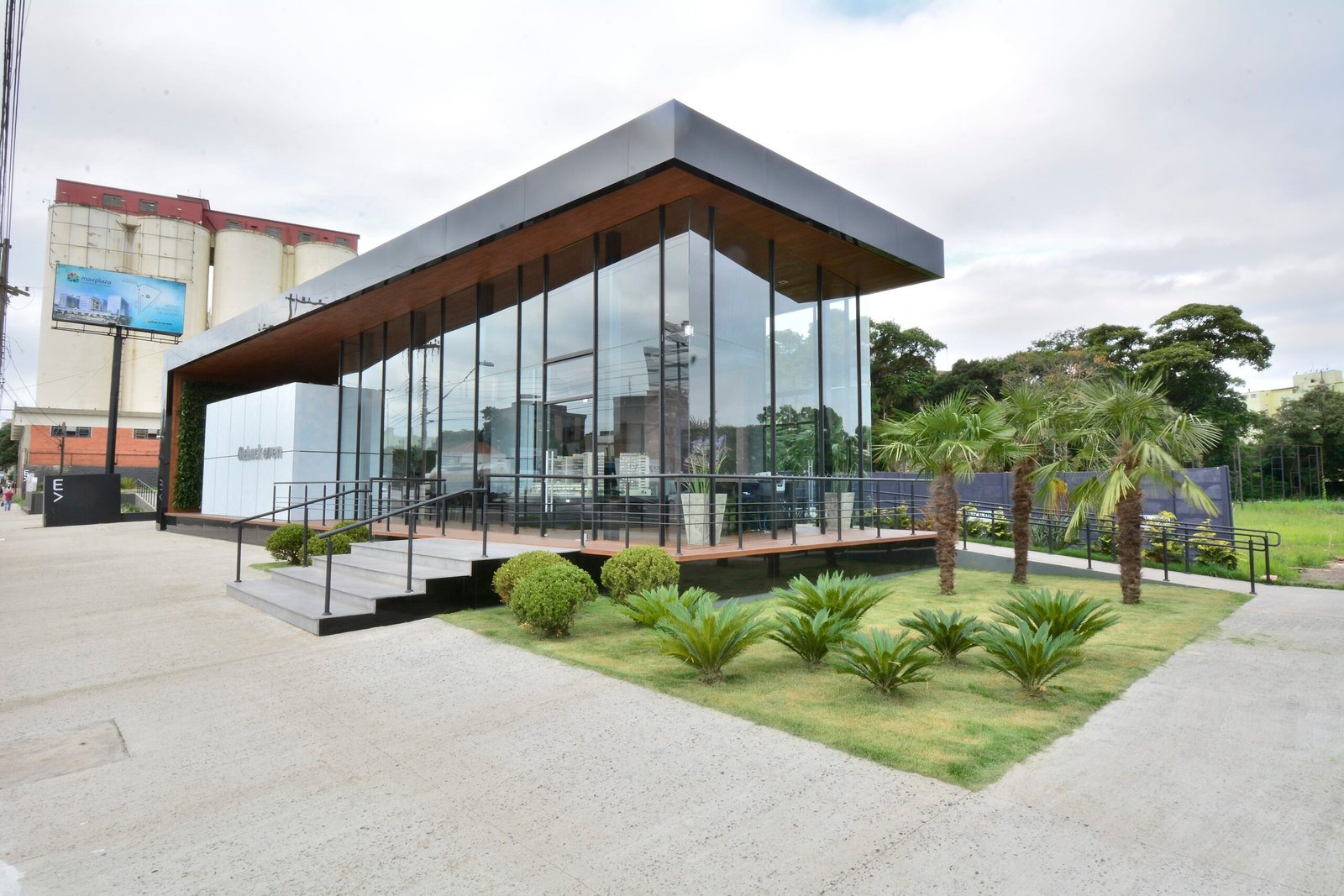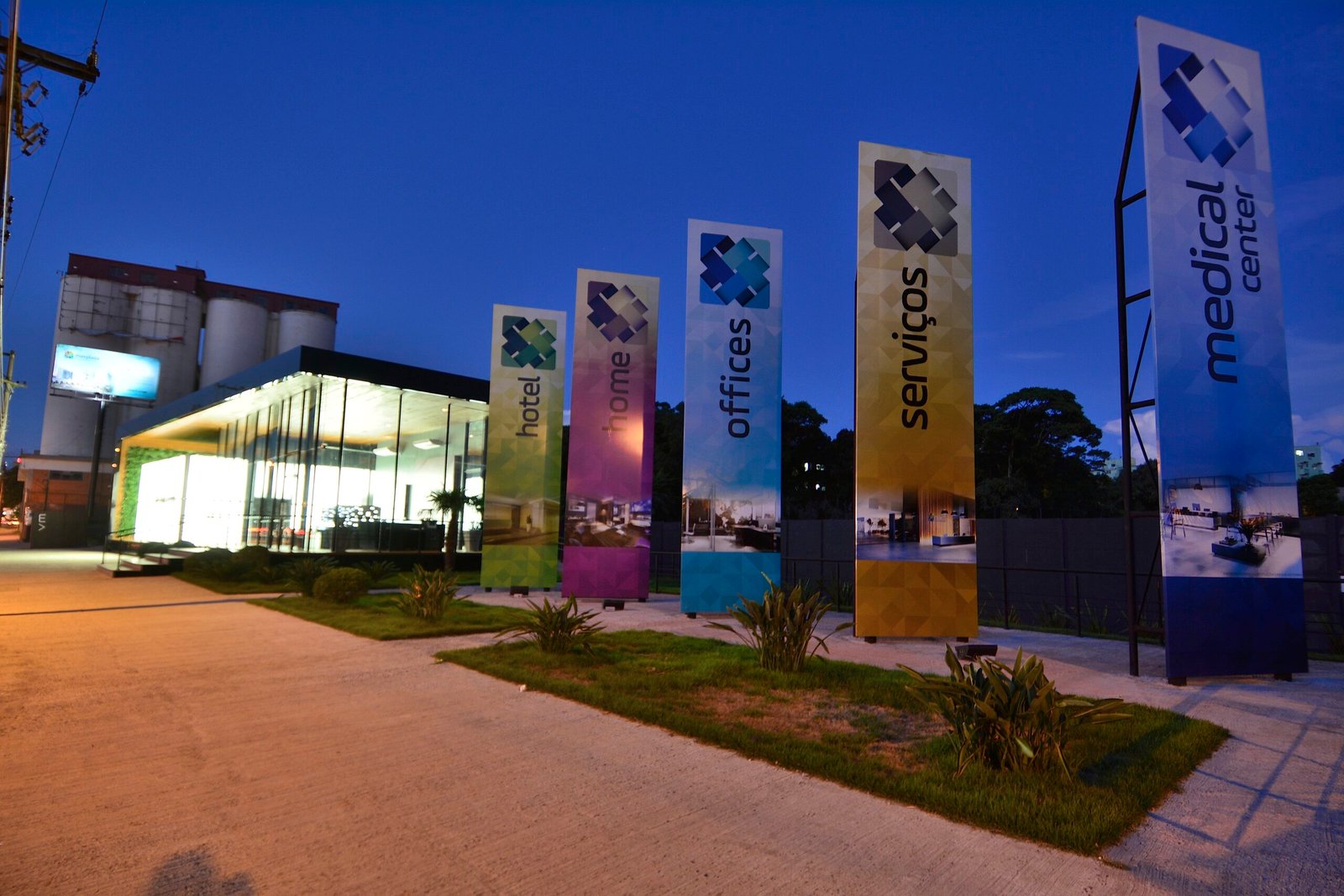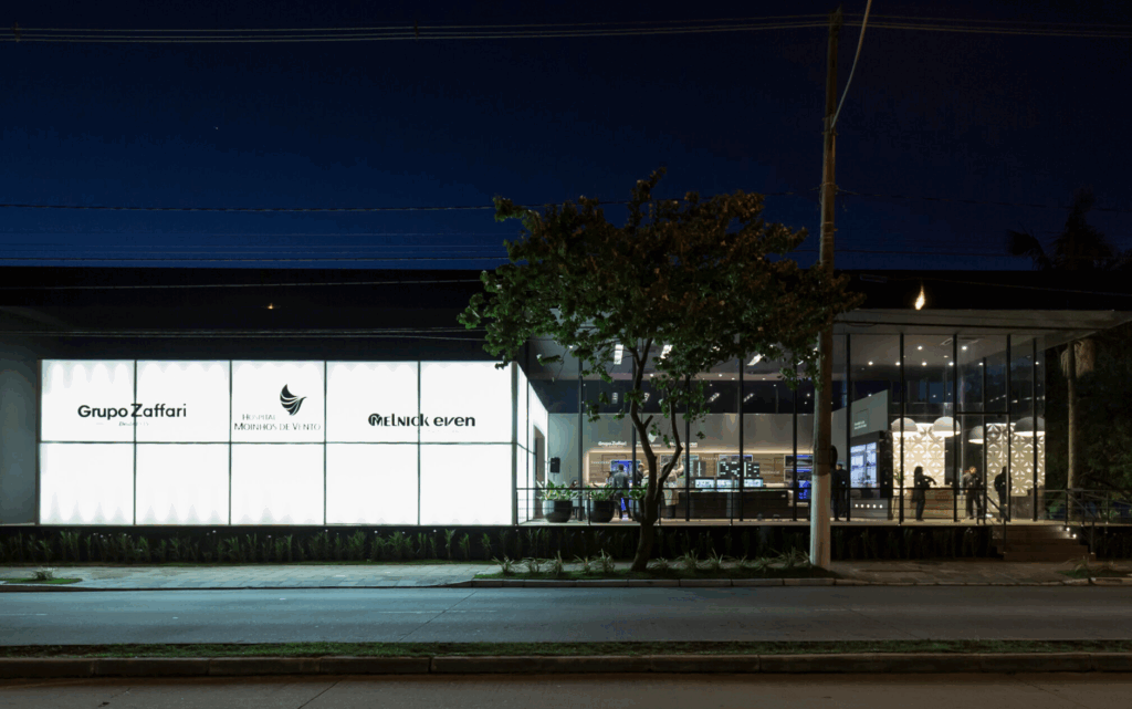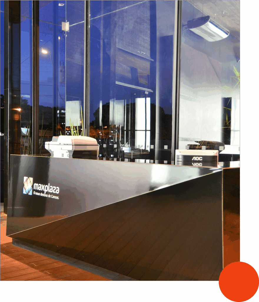 Com o objetivo de comunicar um projeto complexo e relevante, o stand Maxplaza precisava ser visto de uma rodovia de alto fluxo, a BR-116, em Canoas-RS. Para isso, as cores na comunicação visual foram fundamentais e necessárias. Na fachada, a utilização de transparência e iluminação, apresenta de forma clara o conceito e linguagem que o empreendimento levará a região de Canoas.