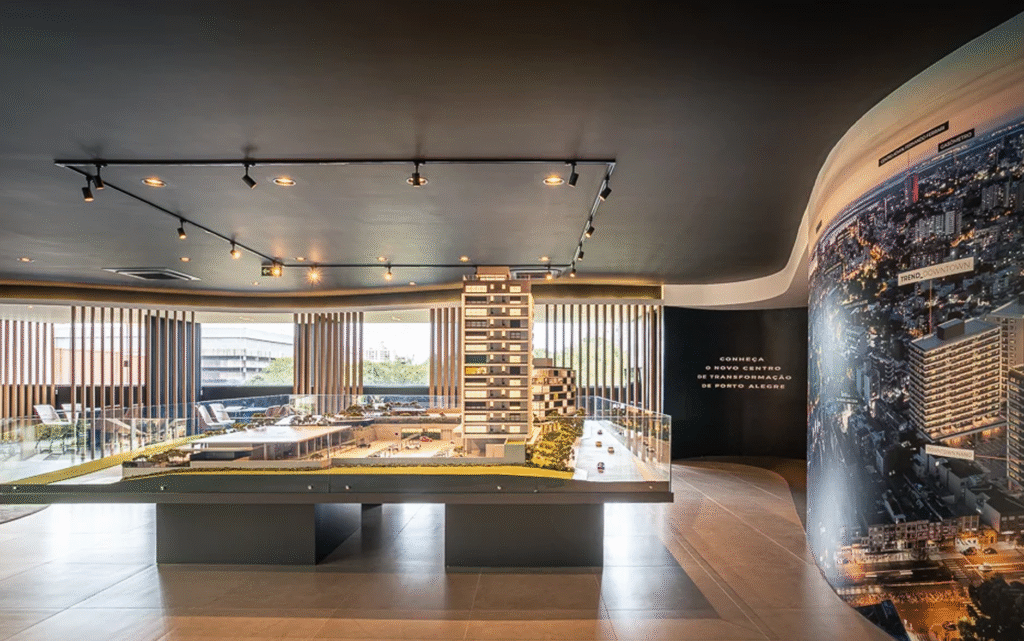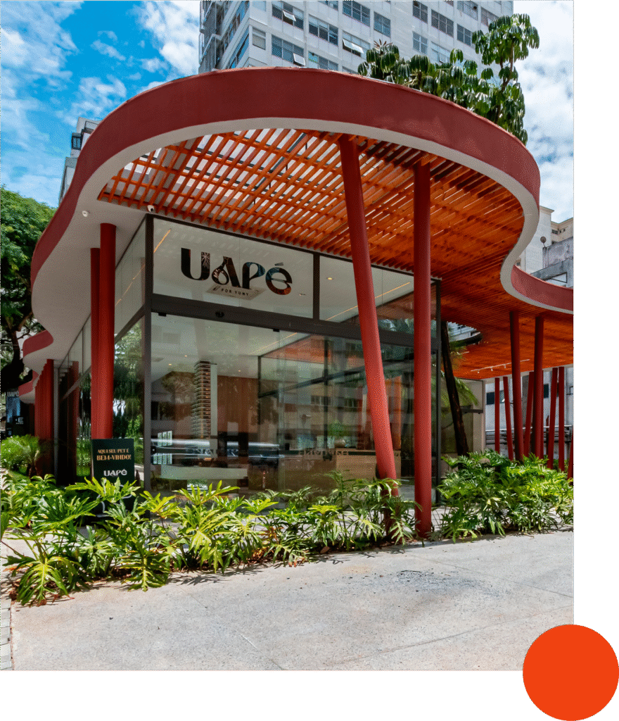 Uapé, nome indígena da vitória-régia, foi o nome escolhido para o empreendimento em homenagem ao norte do país. O conceito do showroom une referências da arquitetura do produto com elementos amazônicos, como a sinuosidade dos rios e uma paleta tropical. O volume principal é marcado por uma ampla cobertura sinuosa, sustentada por pilaretes em tom terracota, que remetem às palafitas — elemento típico da arquitetura ribeirinha. O ripado em madeira na cobertura cria um jogo de luz e sombra característico da mata, enquanto espelhos d’água com floreiras circulares e vegetação tropical reforçam a ambientação natural. O percurso interno, pensado como um rio, conduz o visitante por um traçado sinuoso no piso até o decorado virtual. O atendimento ocorre de forma fluida, distribuído entre sofás, mesas e o bar. A comunicação visual é integrada ao espaço, com elementos da campanha aplicados sutilmente à marcenaria e quadros backlight com plantas e imagens.