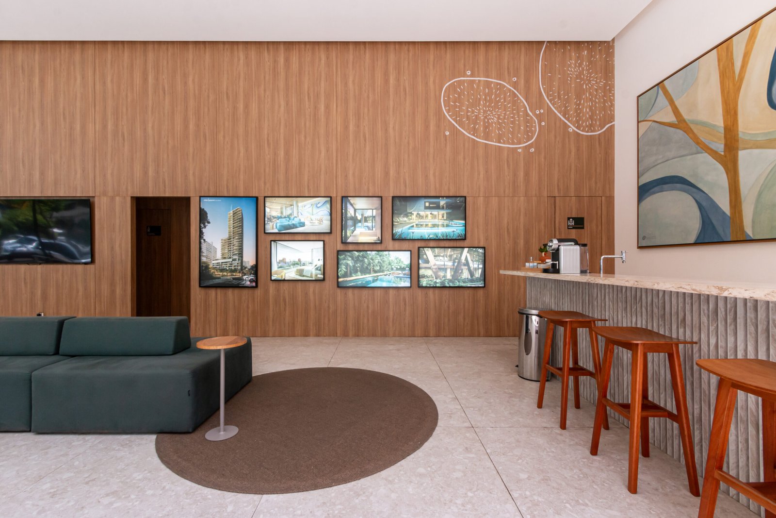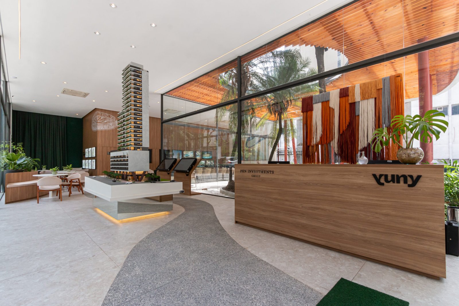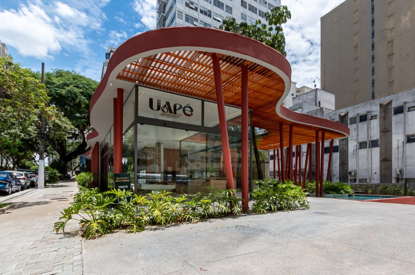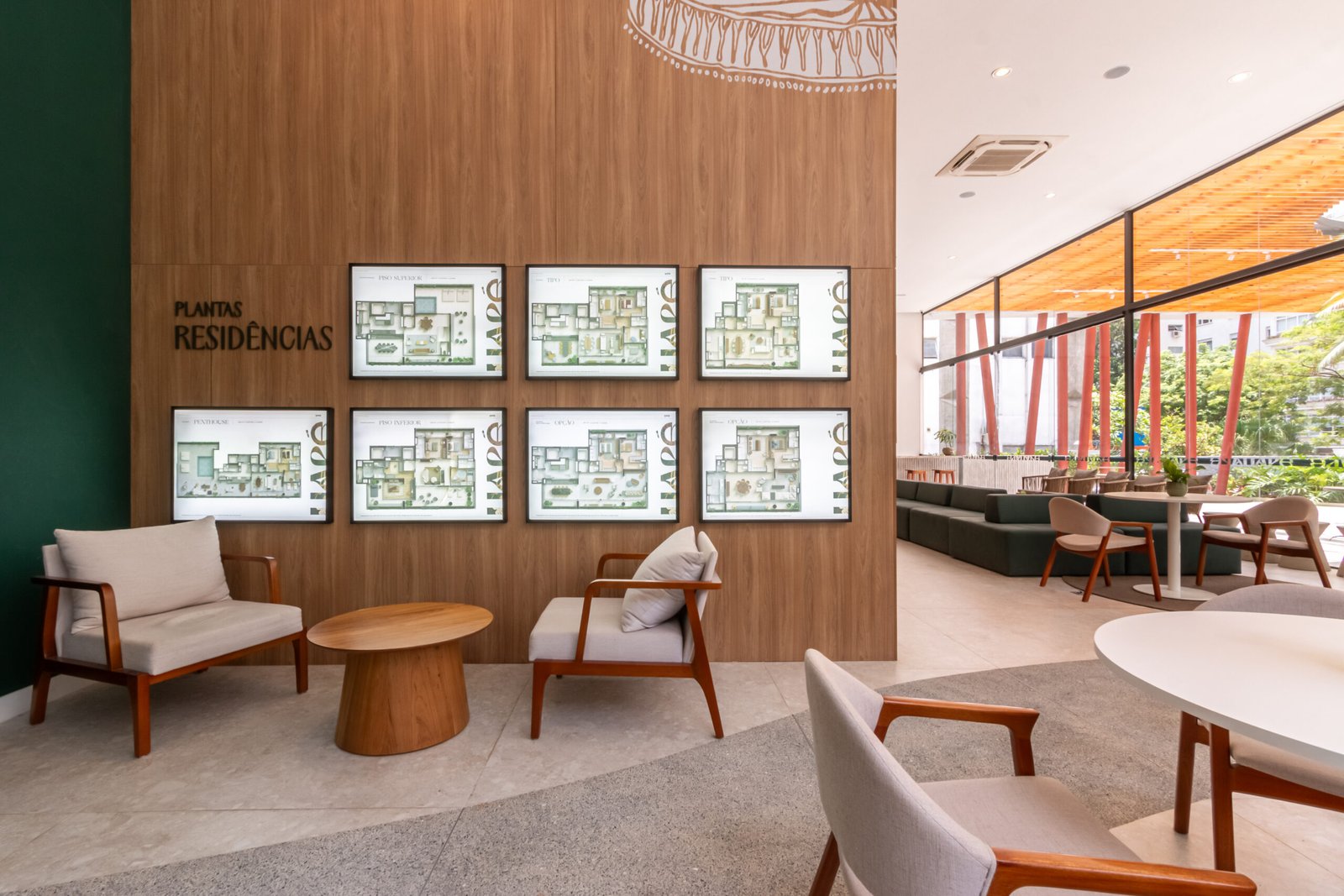Uapé, nome indígena da vitória-régia, foi o nome escolhido para o empreendimento em homenagem ao norte do país. O conceito do showroom une referências da arquitetura do produto com elementos amazônicos, como a sinuosidade dos rios e uma paleta tropical. O volume principal é marcado por uma ampla cobertura sinuosa, sustentada por pilaretes em tom terracota, que remetem às palafitas — elemento típico da arquitetura ribeirinha. O ripado em madeira na cobertura cria um jogo de luz e sombra característico da mata, enquanto espelhos d’água com floreiras circulares e vegetação tropical reforçam a ambientação natural. O percurso interno, pensado como um rio, conduz o visitante por um traçado sinuoso no piso até o decorado virtual. O atendimento ocorre de forma fluida, distribuído entre sofás, mesas e o bar. A comunicação visual é integrada ao espaço, com elementos da campanha aplicados sutilmente à marcenaria e quadros backlight com plantas e imagens.