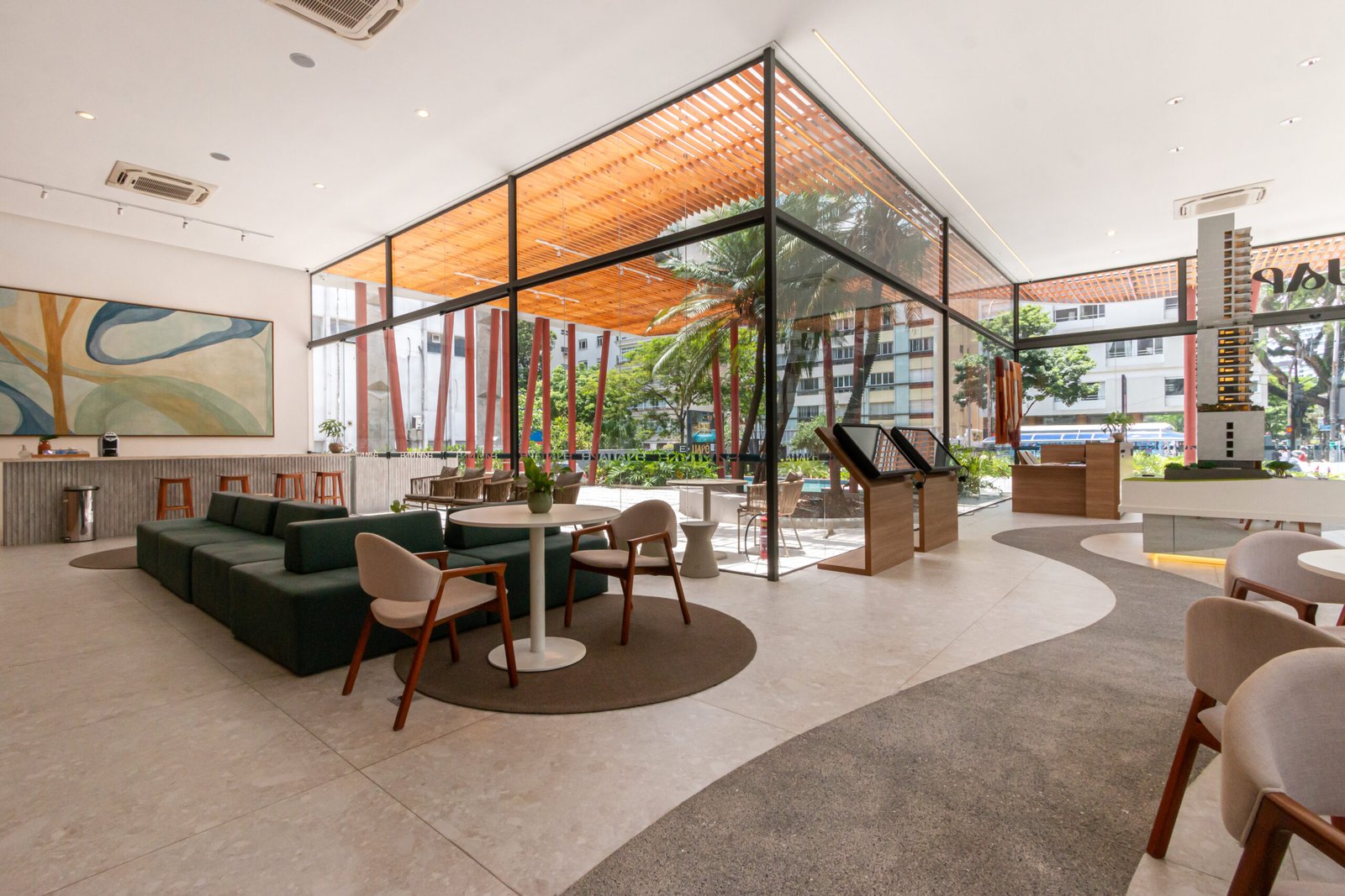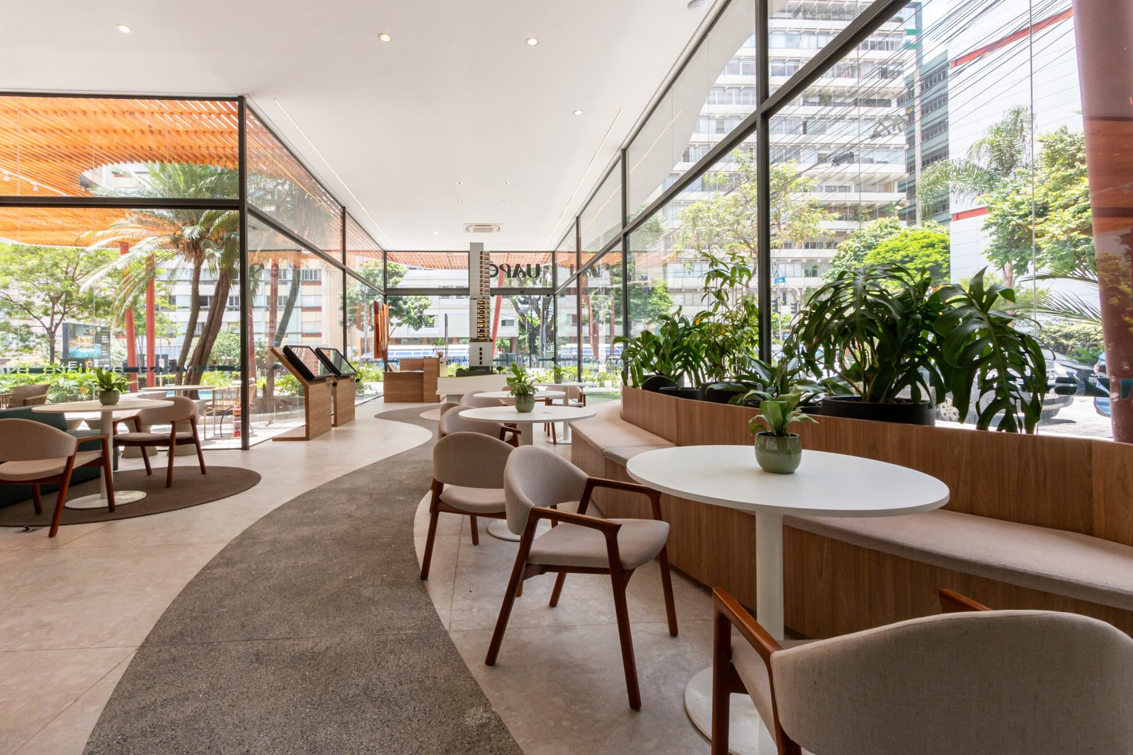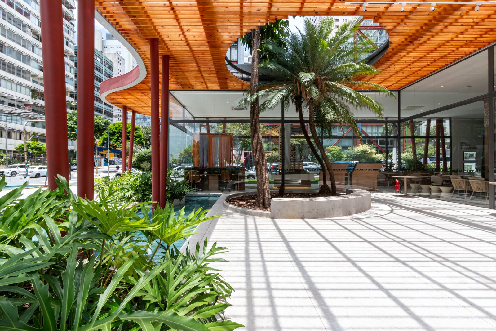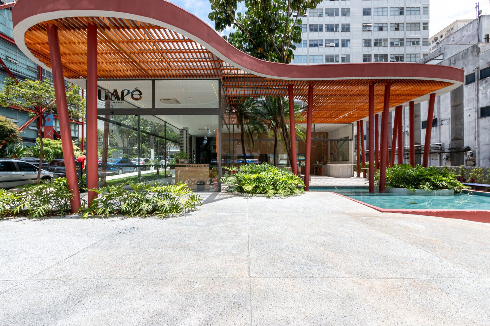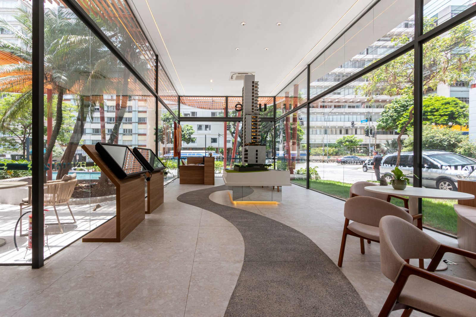 Uapé, nome indígena da vitória-régia, foi o nome escolhido para o empreendimento em homenagem ao norte do país. O conceito do showroom une referências da arquitetura do produto com elementos amazônicos, como a sinuosidade dos rios e uma paleta tropical. O volume principal é marcado por uma ampla cobertura sinuosa, sustentada por pilaretes em tom terracota, que remetem às palafitas — elemento típico da arquitetura ribeirinha. O ripado em madeira na cobertura cria um jogo de luz e sombra característico da mata, enquanto espelhos d’água com floreiras circulares e vegetação tropical reforçam a ambientação natural. O percurso interno, pensado como um rio, conduz o visitante por um traçado sinuoso no piso até o decorado virtual. O atendimento ocorre de forma fluida, distribuído entre sofás, mesas e o bar. A comunicação visual é integrada ao espaço, com elementos da campanha aplicados sutilmente à marcenaria e quadros backlight com plantas e imagens.