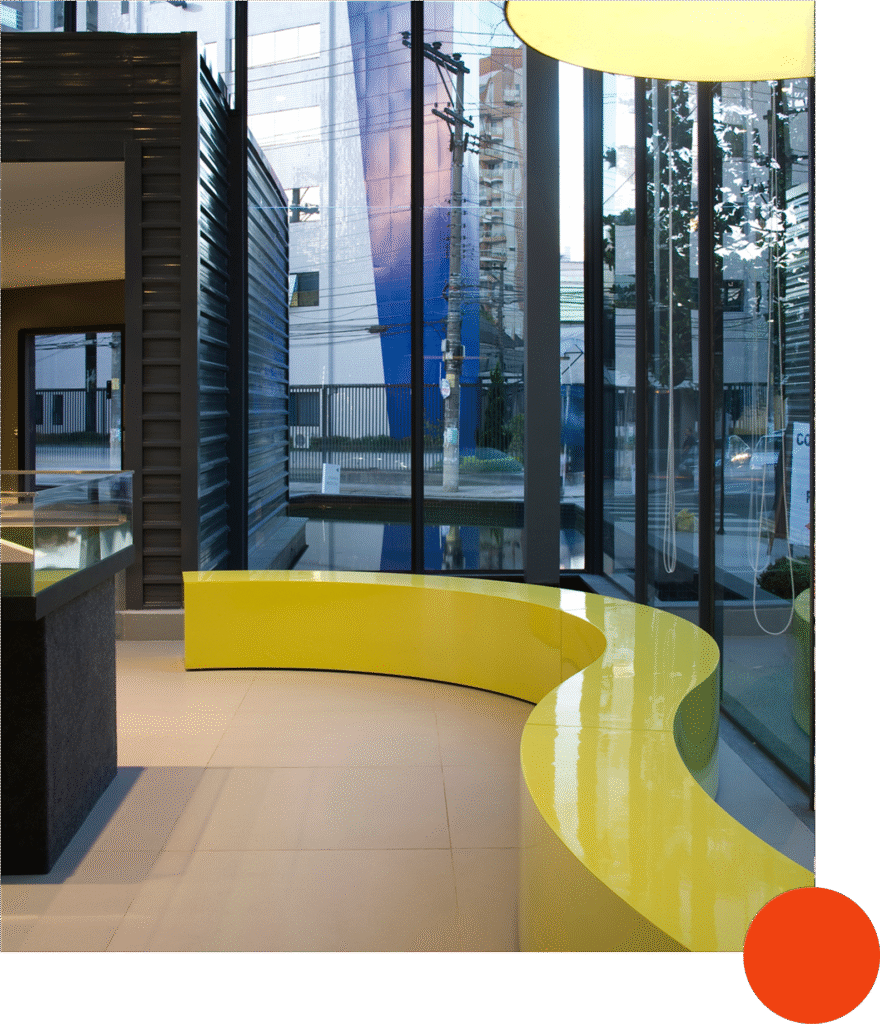 Um dos nossos primeiros projetos em São Paulo, o stand do Vila Olímpia Prime Offices, de 2010, nos orgulha ainda hoje. Localizado em uma das regiões mais valorizadas da capital paulista, e polo de negócios, o stand de metragem reduzida ganhou destaque na paisagem por sua fachada moderna e retroiluminada. Trabalhamos uma composição de volumes de vidro, revestimento metálico e acrílico iluminado. Tecnologia era um dos atributos principais do empreendimento a ser traduzido no ambiente de vendas. Criamos um espaço interno minimalista, com parede projeção na recepção e grandes totens com telas touchscreen.