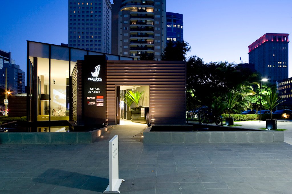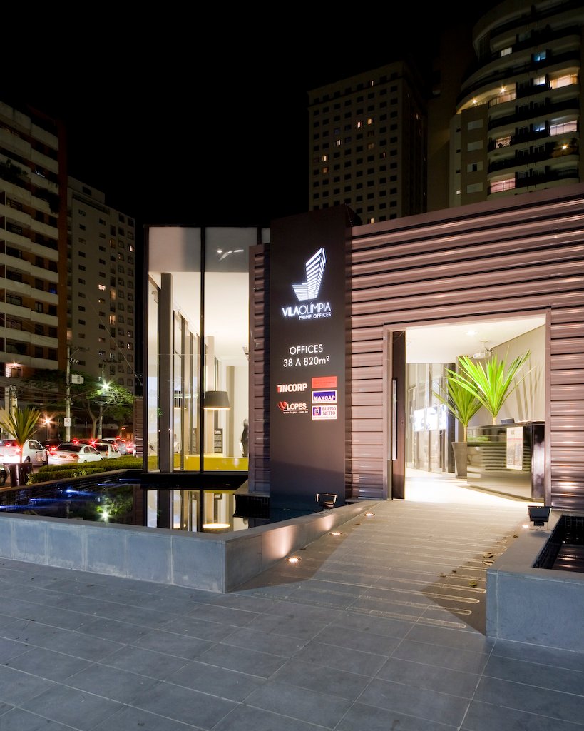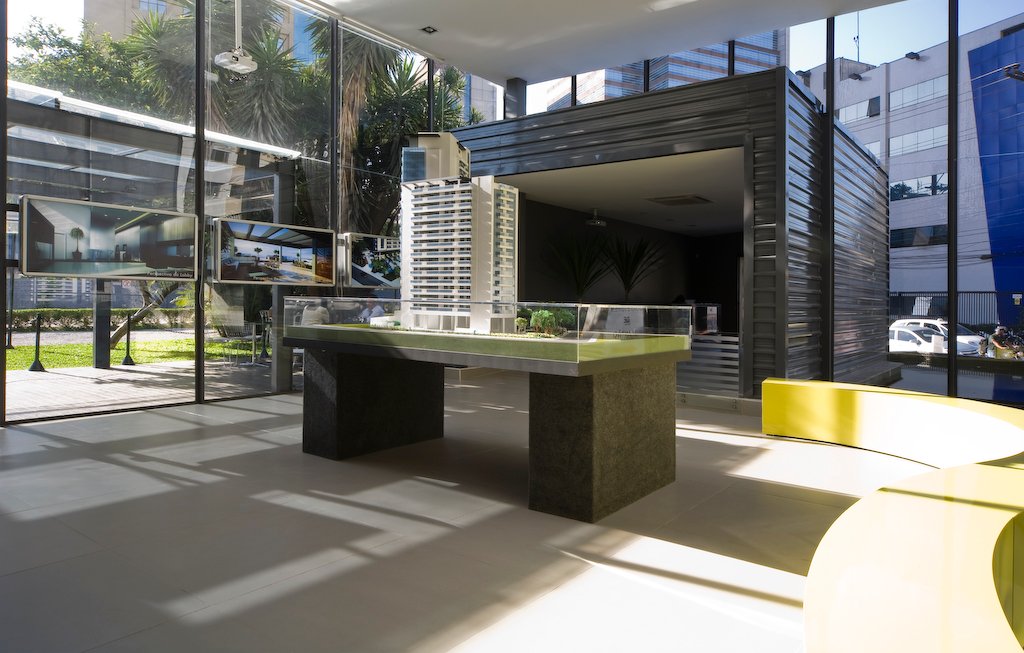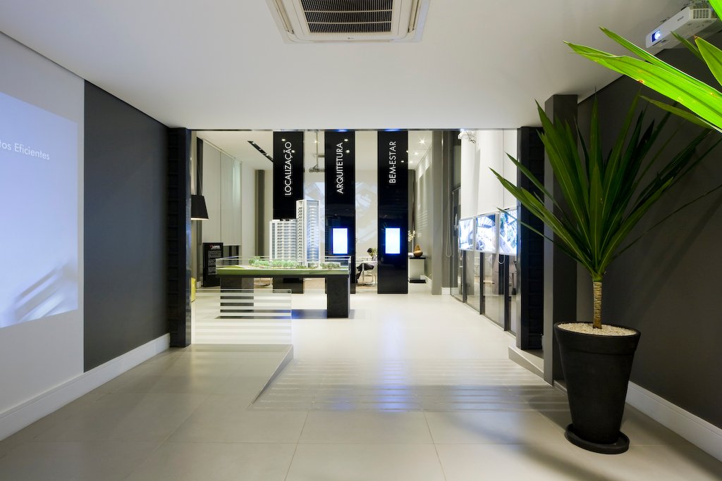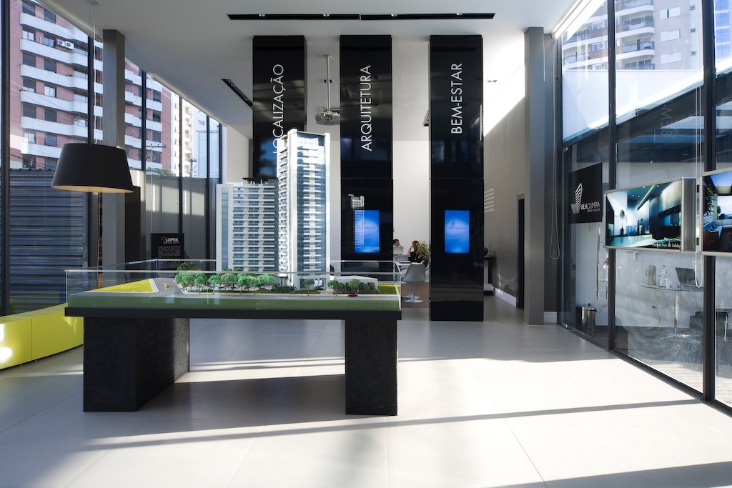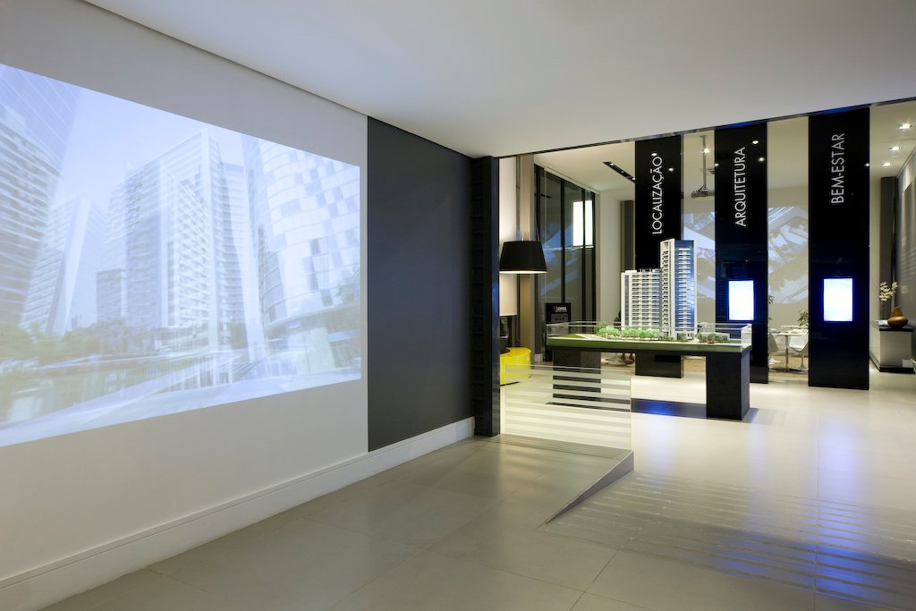 Um dos nossos primeiros projetos em São Paulo, o stand do Vila Olímpia Prime Offices, de 2010, nos orgulha ainda hoje. Localizado em uma das regiões mais valorizadas da capital paulista, e polo de negócios, o stand de metragem reduzida ganhou destaque na paisagem por sua fachada moderna e retroiluminada. Trabalhamos uma composição de volumes de vidro, revestimento metálico e acrílico iluminado. Tecnologia era um dos atributos principais do empreendimento a ser traduzido no ambiente de vendas. Criamos um espaço interno minimalista, com parede projeção na recepção e grandes totens com telas touchscreen.