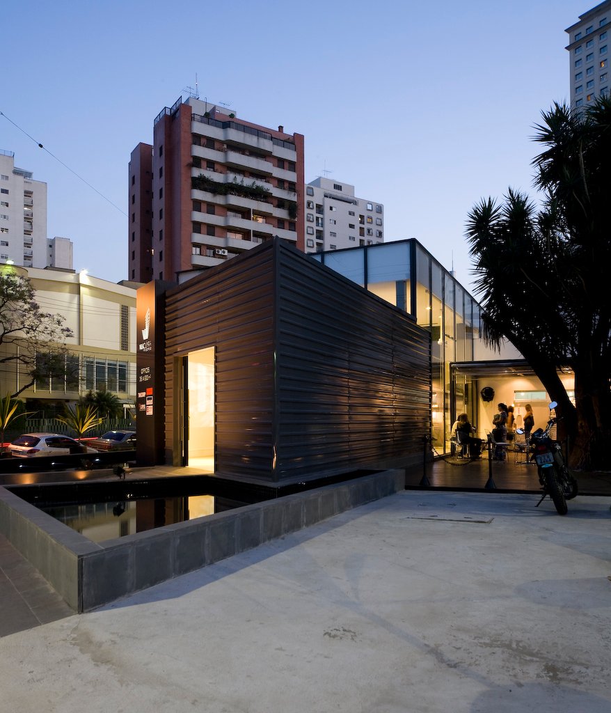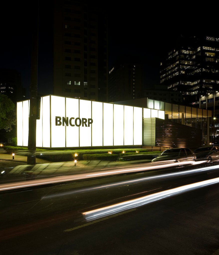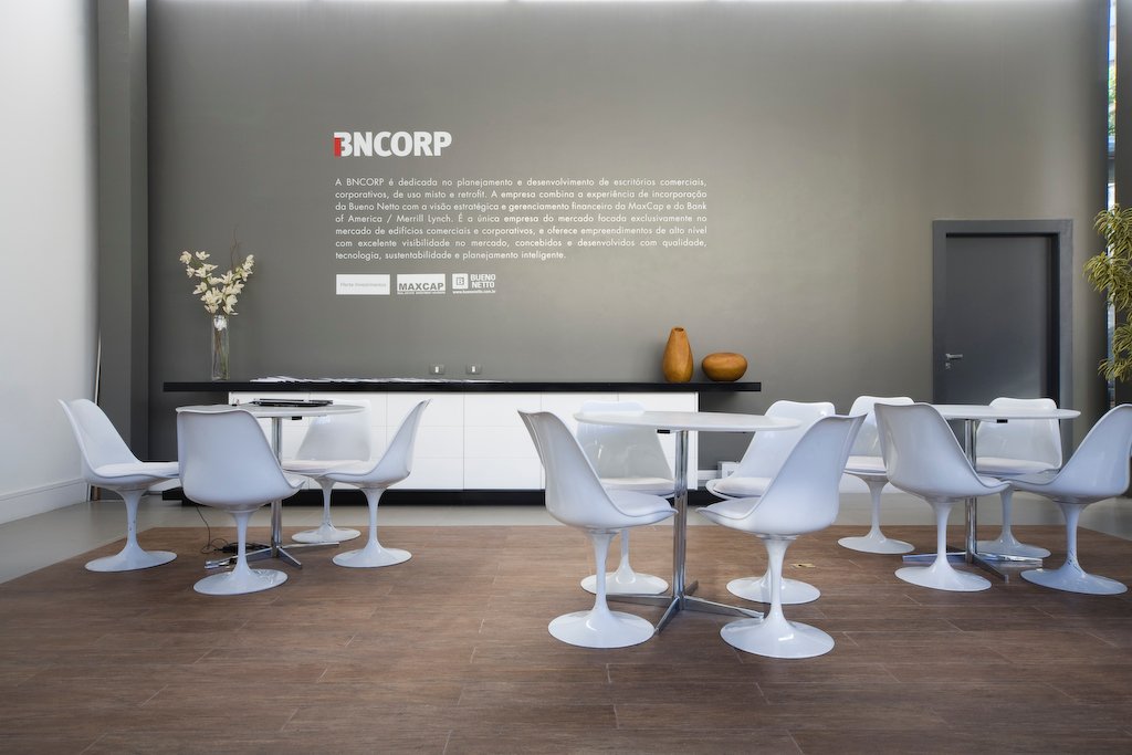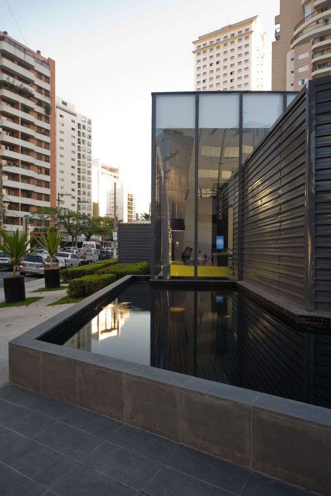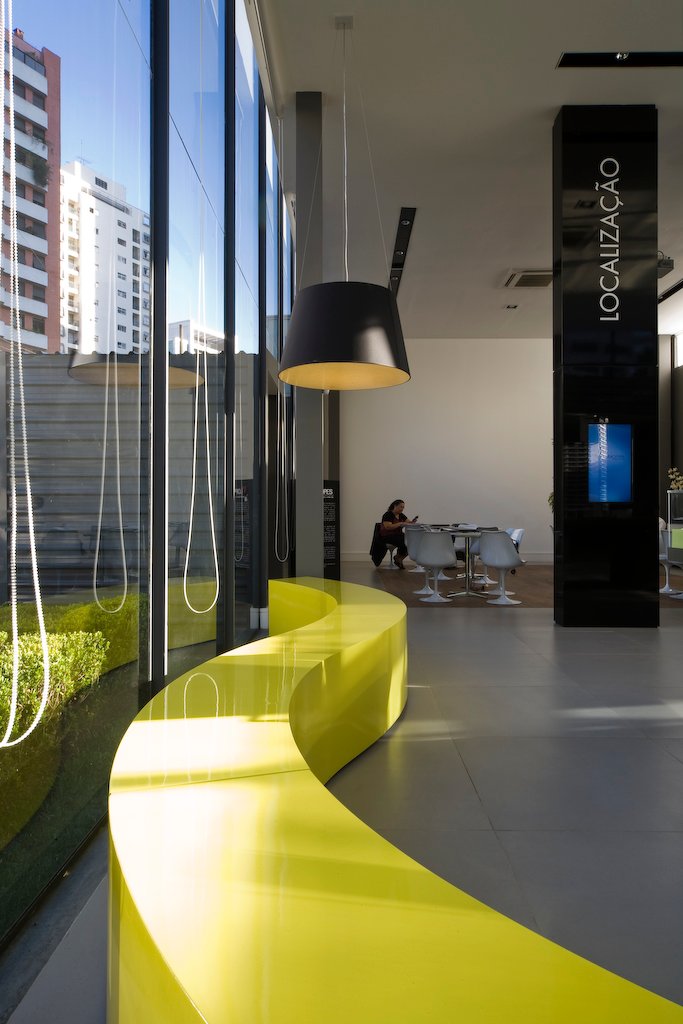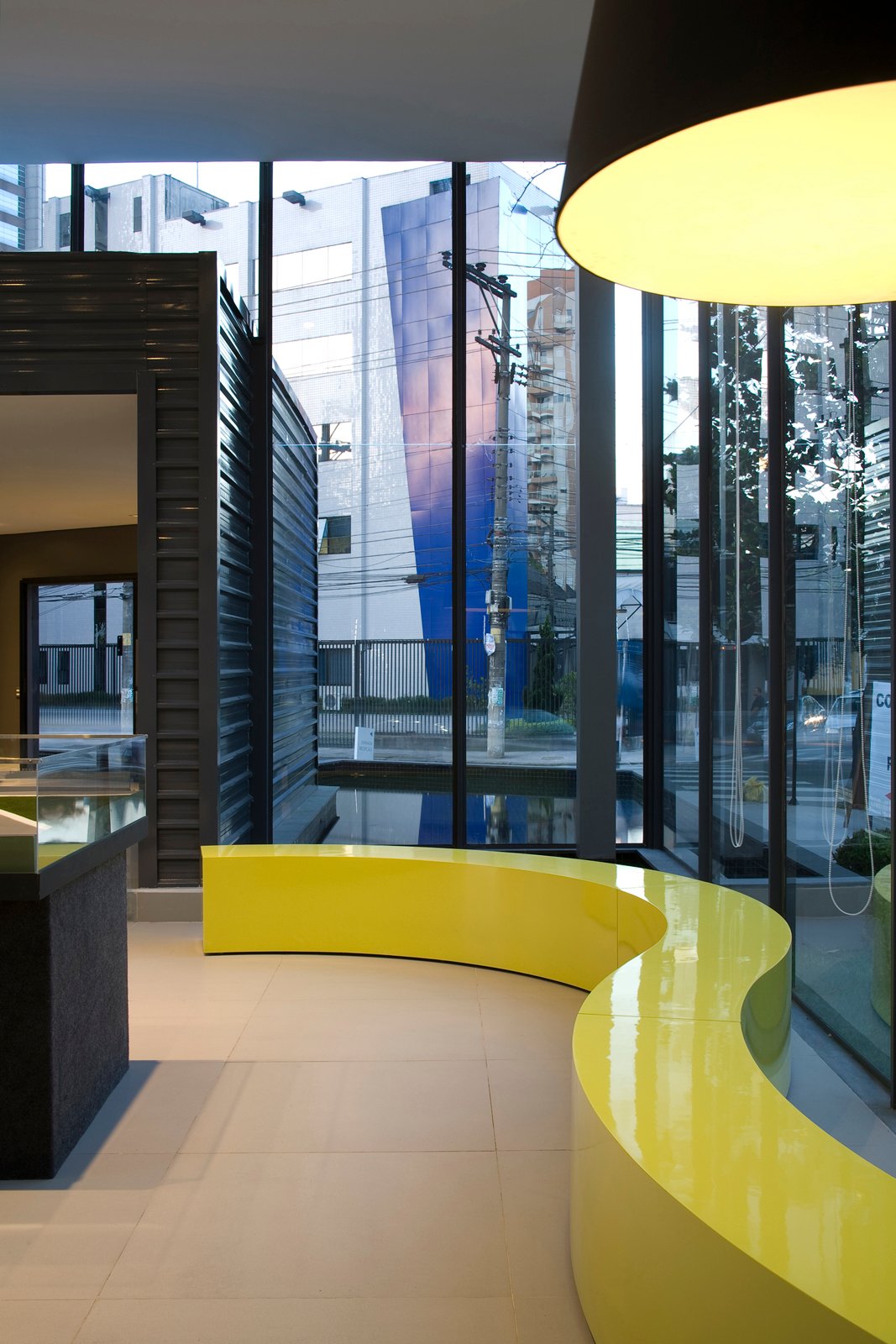 Um dos nossos primeiros projetos em São Paulo, o stand do Vila Olímpia Prime Offices, de 2010, nos orgulha ainda hoje. Localizado em uma das regiões mais valorizadas da capital paulista, e polo de negócios, o stand de metragem reduzida ganhou destaque na paisagem por sua fachada moderna e retroiluminada. Trabalhamos uma composição de volumes de vidro, revestimento metálico e acrílico iluminado. Tecnologia era um dos atributos principais do empreendimento a ser traduzido no ambiente de vendas. Criamos um espaço interno minimalista, com parede projeção na recepção e grandes totens com telas touchscreen.