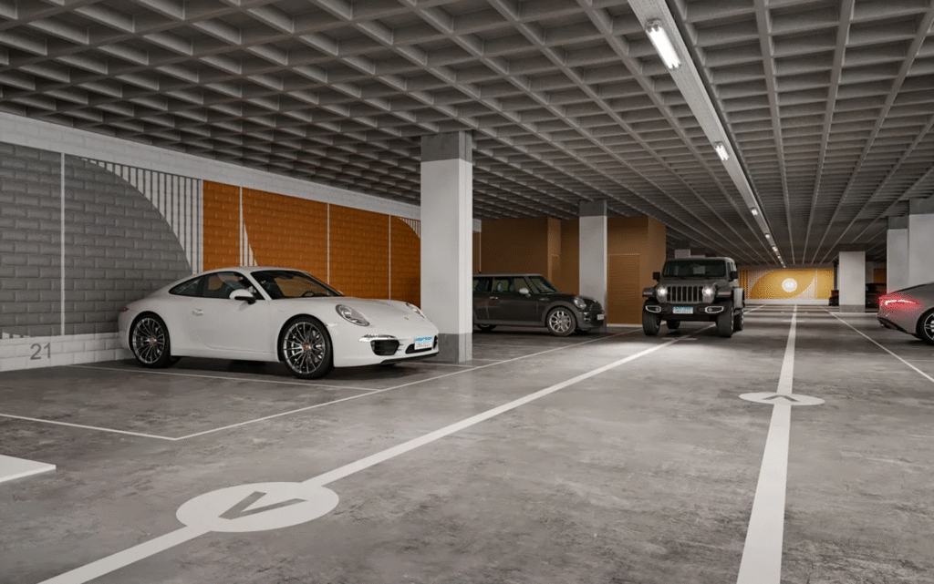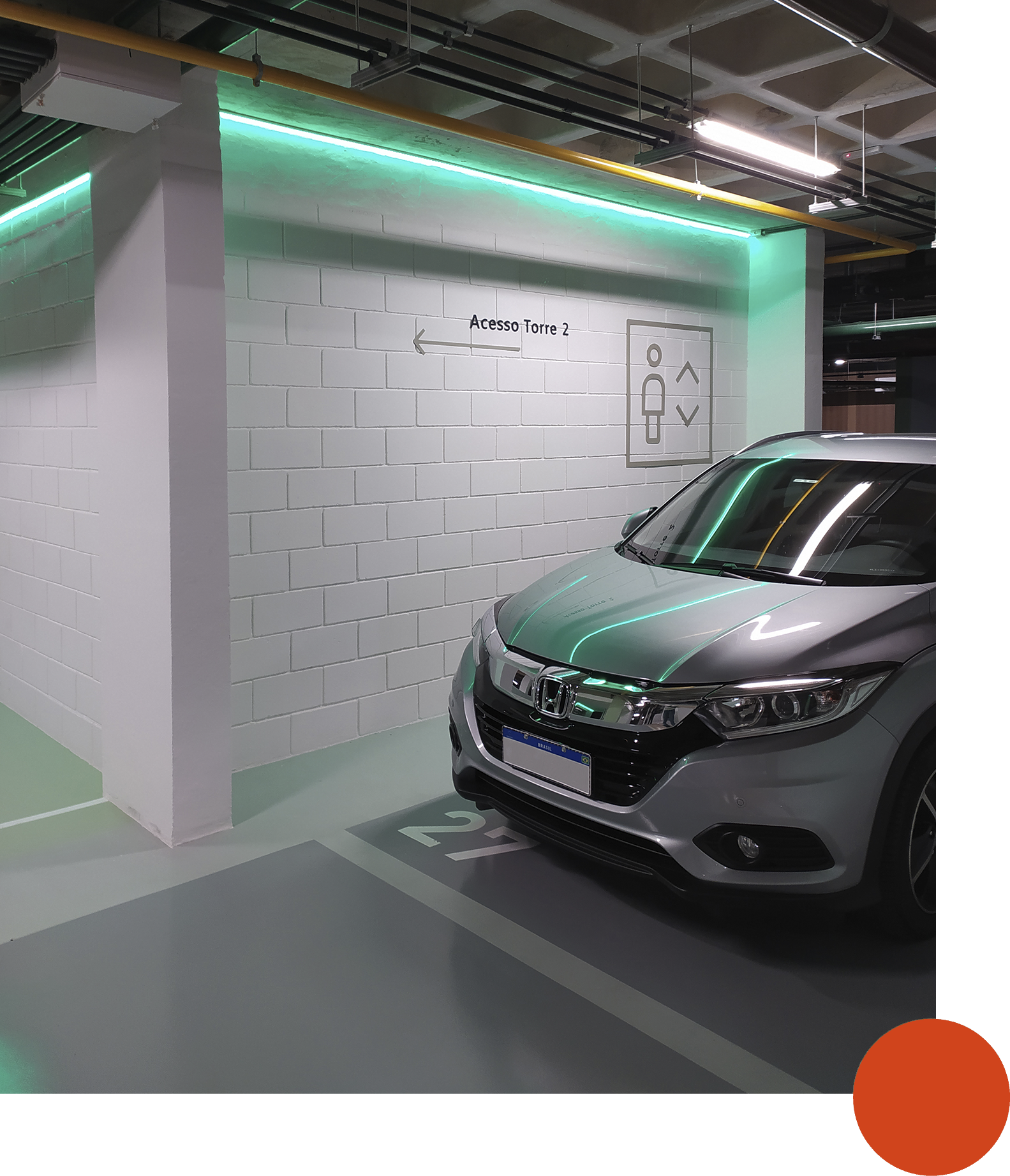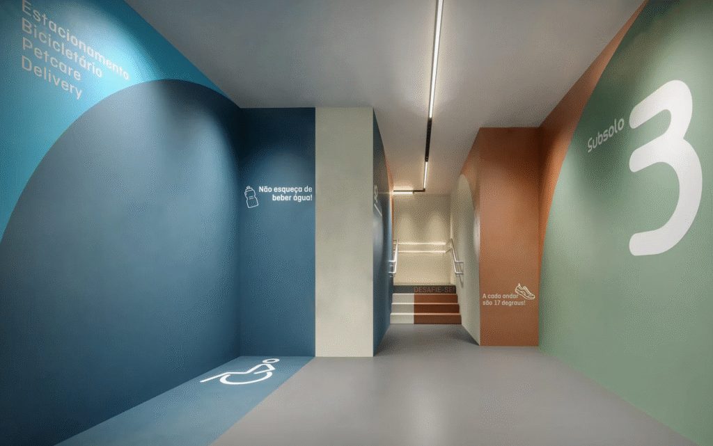 O projeto do Harmony é formado por três torres residenciais e um amplo estacionamento. Para ambientar e organizar os fluxos desse espaço, zoneamos as torres por cor. Cada núcleo de acesso tem uma cor que o identifica – presente na pintura dos pilares do entorno, nos bicicletários, na iluminação dos acessos e nas peças de sinalética – e conduz quem transita pelo lugar.